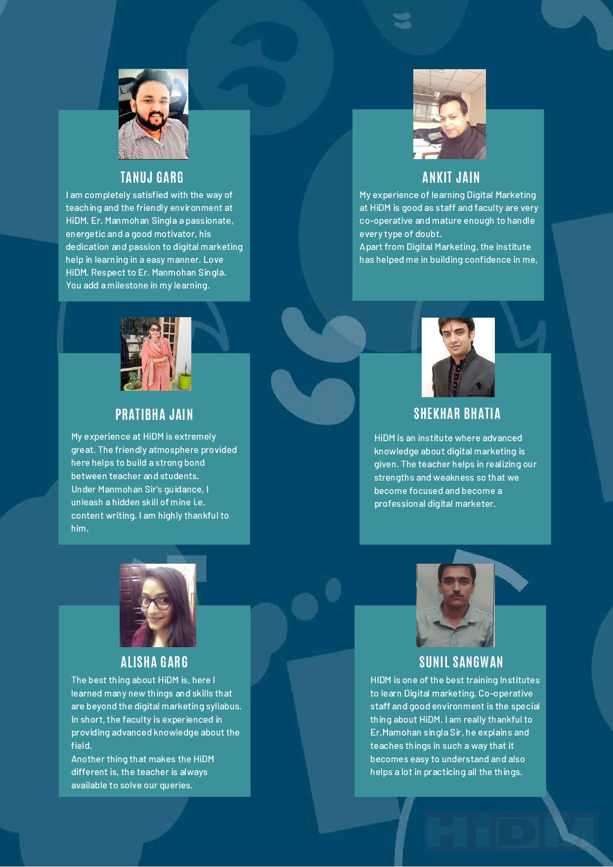 knowledge about digital marketing is given. The teacher helps in realizing our strengths and weakness so that we become focused and become a professional digital marketer. SHEKHAR BHATIA The best thing about HiDM is, here I learned many new things and skills that are beyond the digital marketing syllabus. In short, the faculty is experienced in providing advanced knowledge about the field. Another thing that makes the HiDM different is, the teacher is always available to solve our queries. ALISHA GARG TANUJ GARG My experience at HiDM is extremely great. The friendly atmosphere provided here helps to build a strong bond between teacher and students. Under Manmohan Sir's guidance, I unleash a hidden skill of mine i.e. content writing. I am highly thankful to him. SUNIL SANGWAN I am completely satisfied with the way of teaching and the friendly environment at HiDM. Er. Manmohan Singla a passionate, energetic and a good motivator, his dedication and passion to digital marketing help in learning in a easy manner. Love HiDM. Respect to Er. Manmohan Singla. You add a milestone in my learning. My experience of learning Digital Marketing at HiDM is good as staff and faculty are very co-operative and mature enough to handle every type of doubt. Apart from Digital Marketing, the institute has helped me in building confidence in me, HIDM is one of the best training Institutes to learn Digital marketing. Co-operative staff and good environment is the special thing about HiDM. I am really thankful to Er.Mamohan singla Sir, he explains and teaches things in such a way that it becomes easy to understand and also helps a lot in practicing all the things.