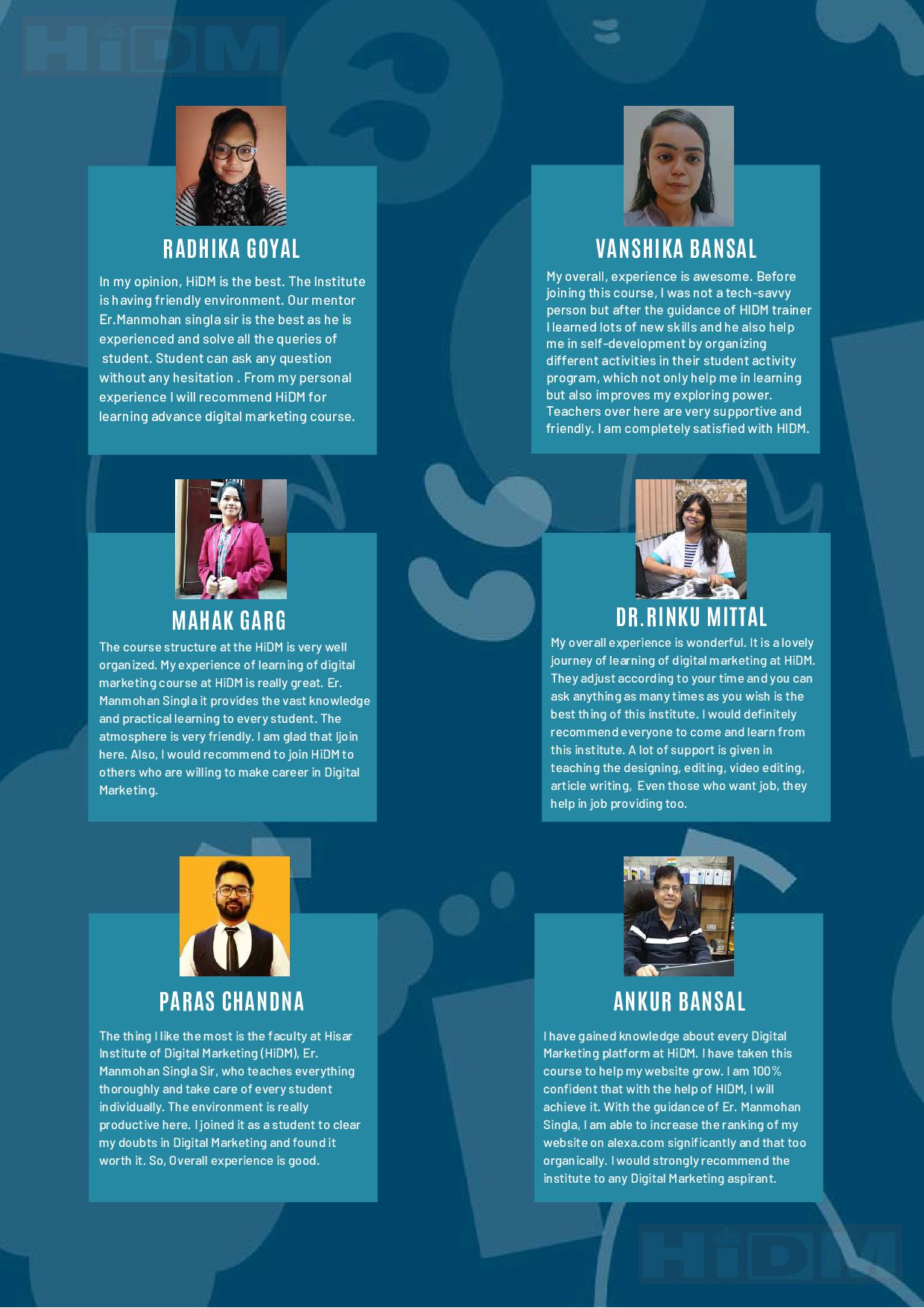 whether it's a theory part or practical work. I like the teaching pattern and study environment at HiDM. Manmohan sir has taught the digital skills so efficiently that now I can proudly say I am a digital marketing professional and would surely recommend HiDM to all digital marketing course aspirants. YASH WALIA Institute's ambience is so positive that you yourself feel productive while entering. Manmohan Singla sir teaches very well. He also covered relevant topics beyond the syllabus to provide extra knowledge. The smart class feature available here has made learning easier for me. After learning digital marketing from HiDM, now I am very confident about my digital marketing skills. SACHIN MALIK HiDM shaped me from the day one to face the corporate world. The environment in the HiDM has taught me to be innovative and meticulous in approach to any strategic goals set for a professional. It was the support of my mentor Er. Manmohan Singla which motivated me to THINK BIG & GET BIG. Thank You HiDM for bringing a positive attitude in me to face life challenges. ASHWANI GAUR HiDM helps in developing the overall personality of the students, boost confidence in them and provides with wide knowledge and exposure to the corporate world. Personally I was very impressed with the quality of the teaching and faculty support. Mentor Er. Manmohan singla ensures that each student gets a perfect blend of both academic theory and practical business experience. I am proud to be associated with HiDM. NAVNEET “Encouraging us to be innovative, independent and act on our own’- This, I would say, is the best thing I felt about HiDM. Our knowledge and skills were enlightened with care by well qualified faculty Er. Manmohan singla. It gave me a platform where I learn team work, leadership skills along with digital marketing skills. HiDM has expanded my career possibilities in the future by giving me the knowledge basis to apply toward a focused career path. NANCY BANSAL My overall experience to date has been amazing. HiDM has provided me with a number of opportunities to grow and explore my skills. The emphasis on learning and exploring the new things in digital helped me a lot. I have always found a positive and healthy environment. Most of my doubts were cleared after the classes get over. Manmohan sir has deep knowledge and vast experience in digital marketing that he share with students. .