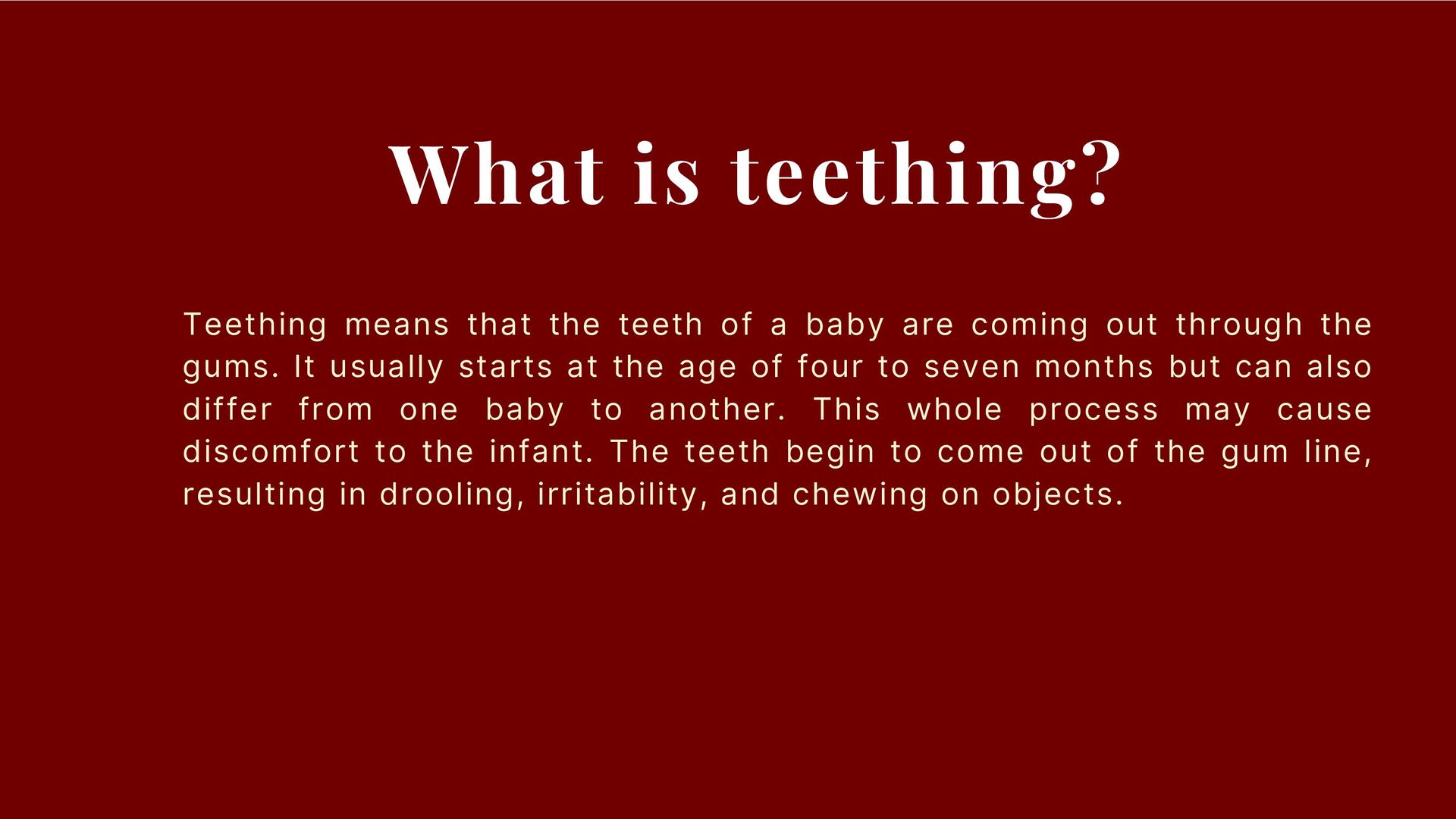 baby are coming out through the gums. It usually starts at the age of four to seven months but can also differ from one baby to another. This whole process may cause discomfort to the infant. The teeth begin to come out of the gum line, resulting in drooling, irritability, and chewing on objects.
