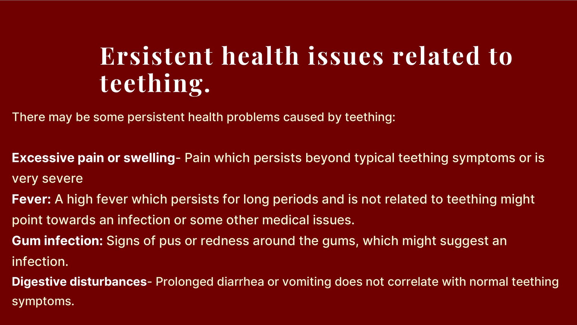 persistent health problems caused by teething: Excessive pain or swelling- Pain which persists beyond typical teething symptoms or is very severe Fever: A high fever which persists for long periods and is not related to teething might point towards an infection or some other medical issues. Gum infection: Signs of pus or redness around the gums, which might suggest an infection. Digestive disturbances- Prolonged diarrhea or vomiting does not correlate with normal teething symptoms.