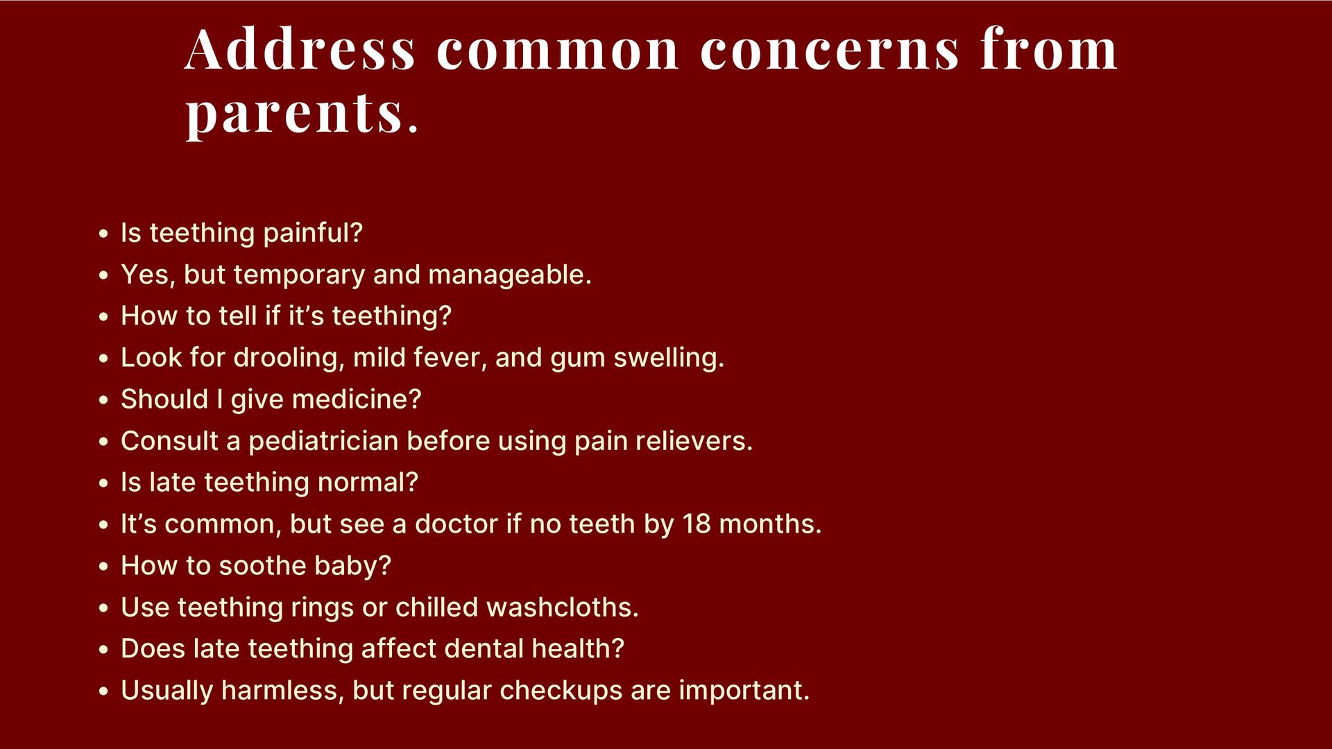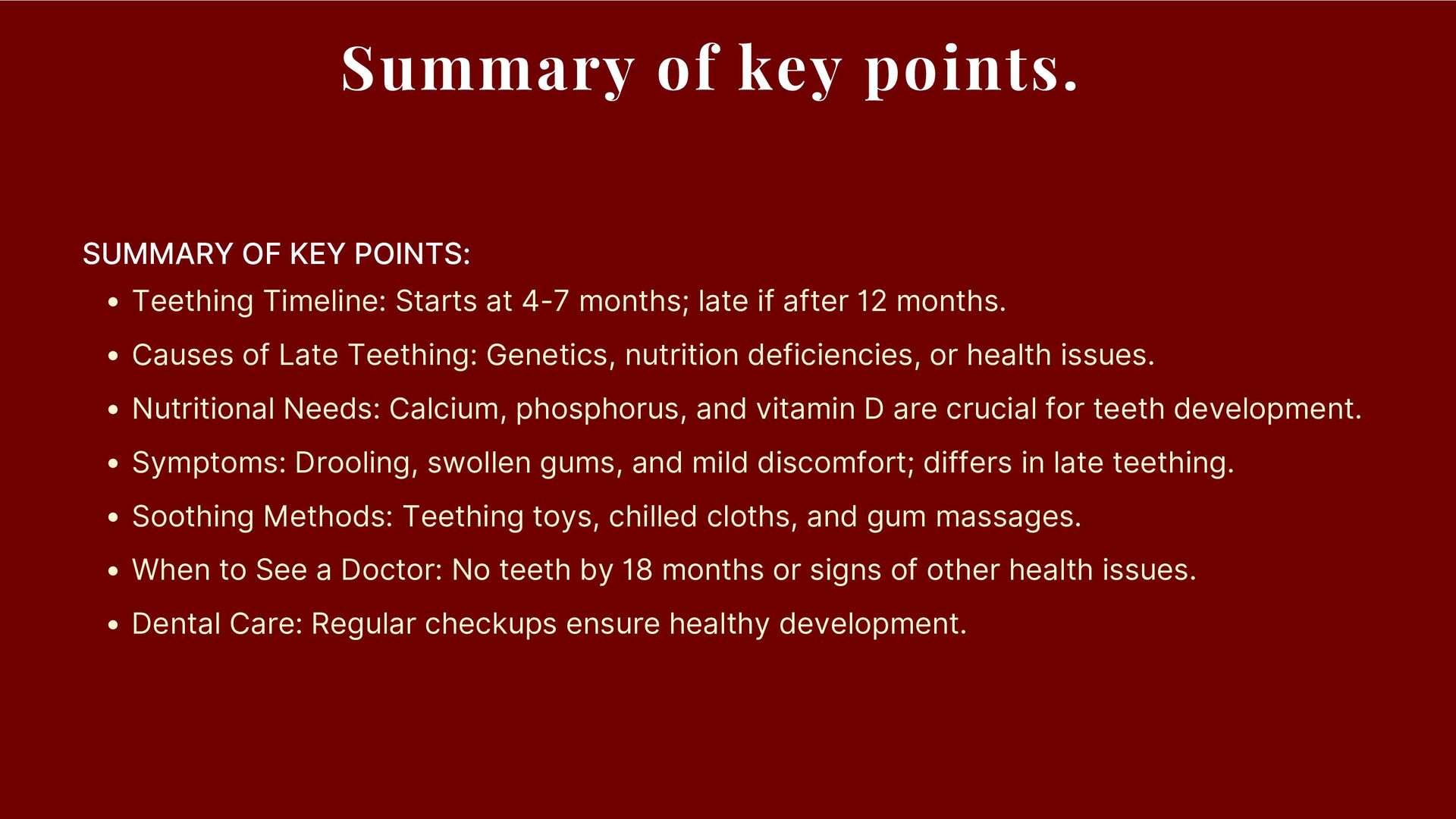 Starts at 4-7 months; late if after 12 months. Causes of Late Teething: Genetics, nutrition deficiencies, or health issues. Nutritional Needs: Calcium, phosphorus, and vitamin D are crucial for teeth development. Symptoms: Drooling, swollen gums, and mild discomfort; differs in late teething. Soothing Methods: Teething toys, chilled cloths, and gum massages. When to See a Doctor: No teeth by 18 months or signs of other health issues. Dental Care: Regular checkups ensure healthy development.