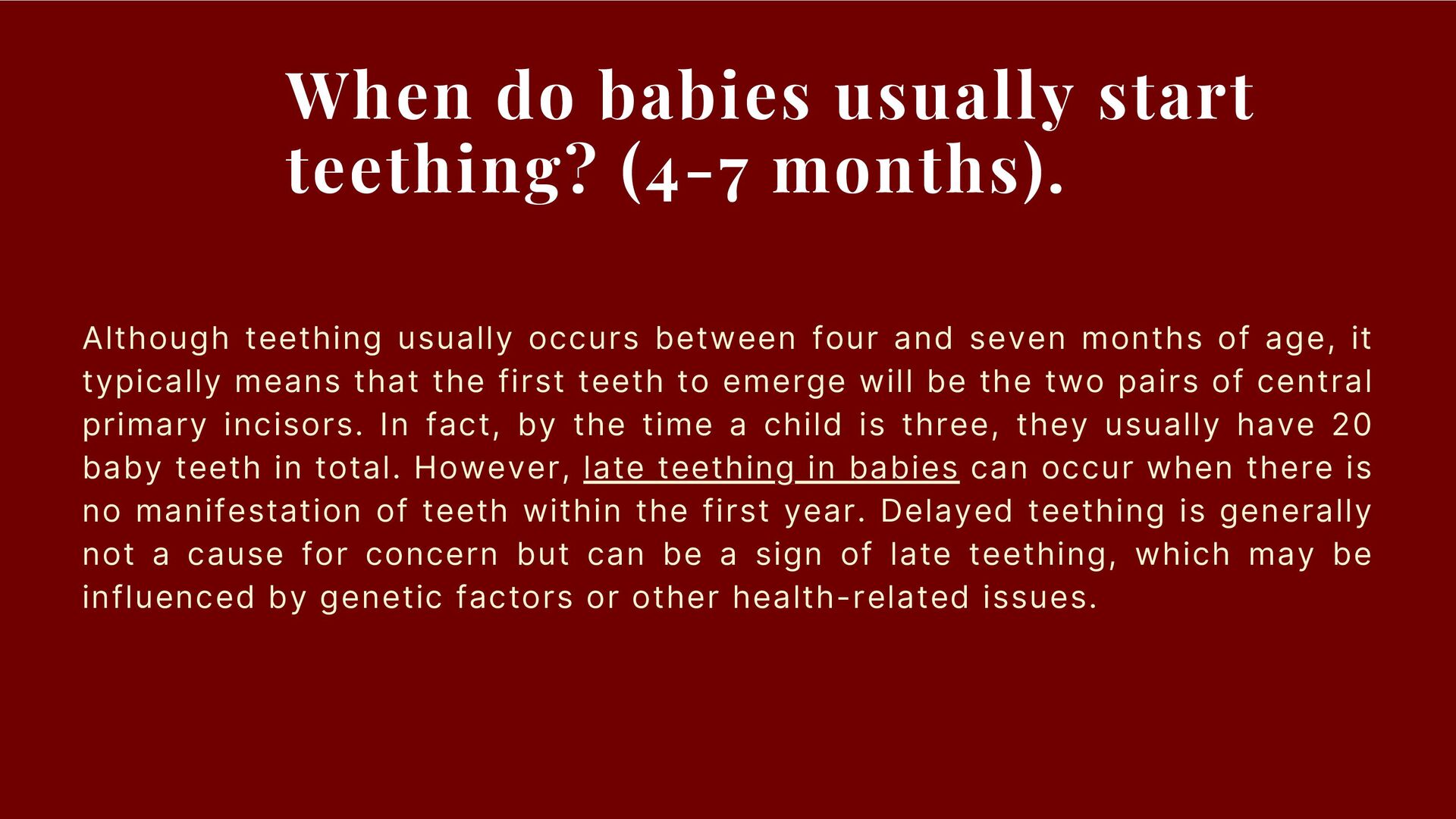 usually occurs between four and seven months of age, it typically means that the first teeth to emerge will be the two pairs of central primary incisors. In fact, by the time a child is three, they usually have 20 baby teeth in total. However, late teething in babies can occur when there is no manifestation of teeth within the first year. Delayed teething is generally not a cause for concern but can be a sign of late teething, which may be influenced by genetic factors or other health-related issues.