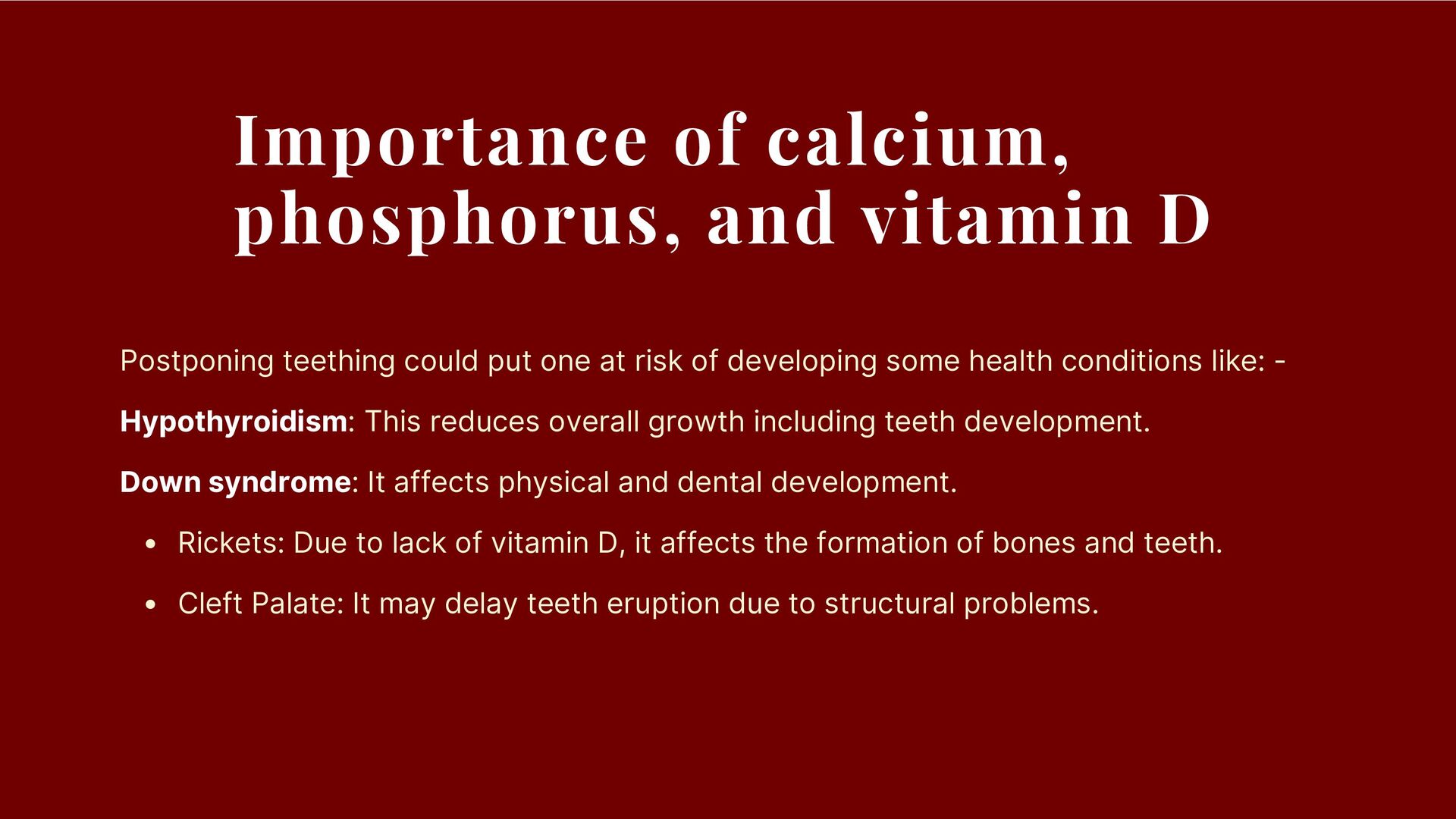 health conditions like: - Hypothyroidism: This reduces overall growth including teeth development. Down syndrome: It affects physical and dental development. Rickets: Due to lack of vitamin D, it affects the formation of bones and teeth. Cleft Palate: It may delay teeth eruption due to structural problems. Importance of calcium, phosphorus, and vitamin D