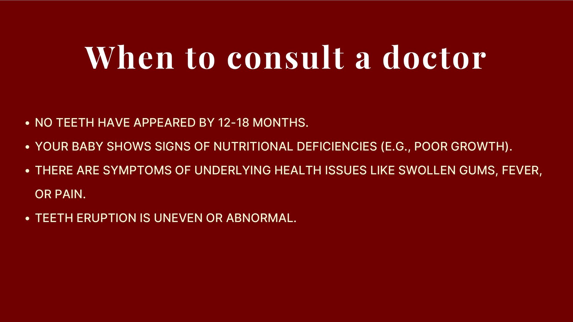12-18 MONTHS. YOUR BABY SHOWS SIGNS OF NUTRITIONAL DEFICIENCIES (E.G., POOR GROWTH). THERE ARE SYMPTOMS OF UNDERLYING HEALTH ISSUES LIKE SWOLLEN GUMS, FEVER, OR PAIN. TEETH ERUPTION IS UNEVEN OR ABNORMAL.