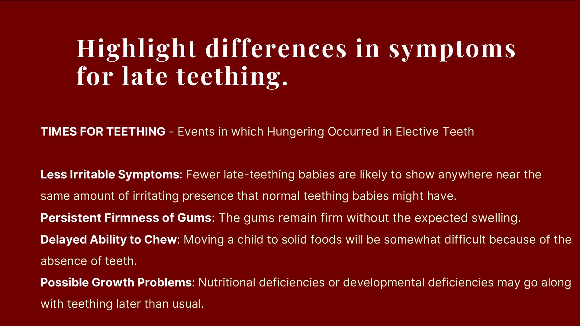 - Events in which Hungering Occurred in Elective Teeth Less Irritable Symptoms: Fewer late-teething babies are likely to show anywhere near the same amount of irritating presence that normal teething babies might have. Persistent Firmness of Gums: The gums remain firm without the expected swelling. Delayed Ability to Chew: Moving a child to solid foods will be somewhat difficult because of the absence of teeth. Possible Growth Problems: Nutritional deficiencies or developmental deficiencies may go along with teething later than usual.