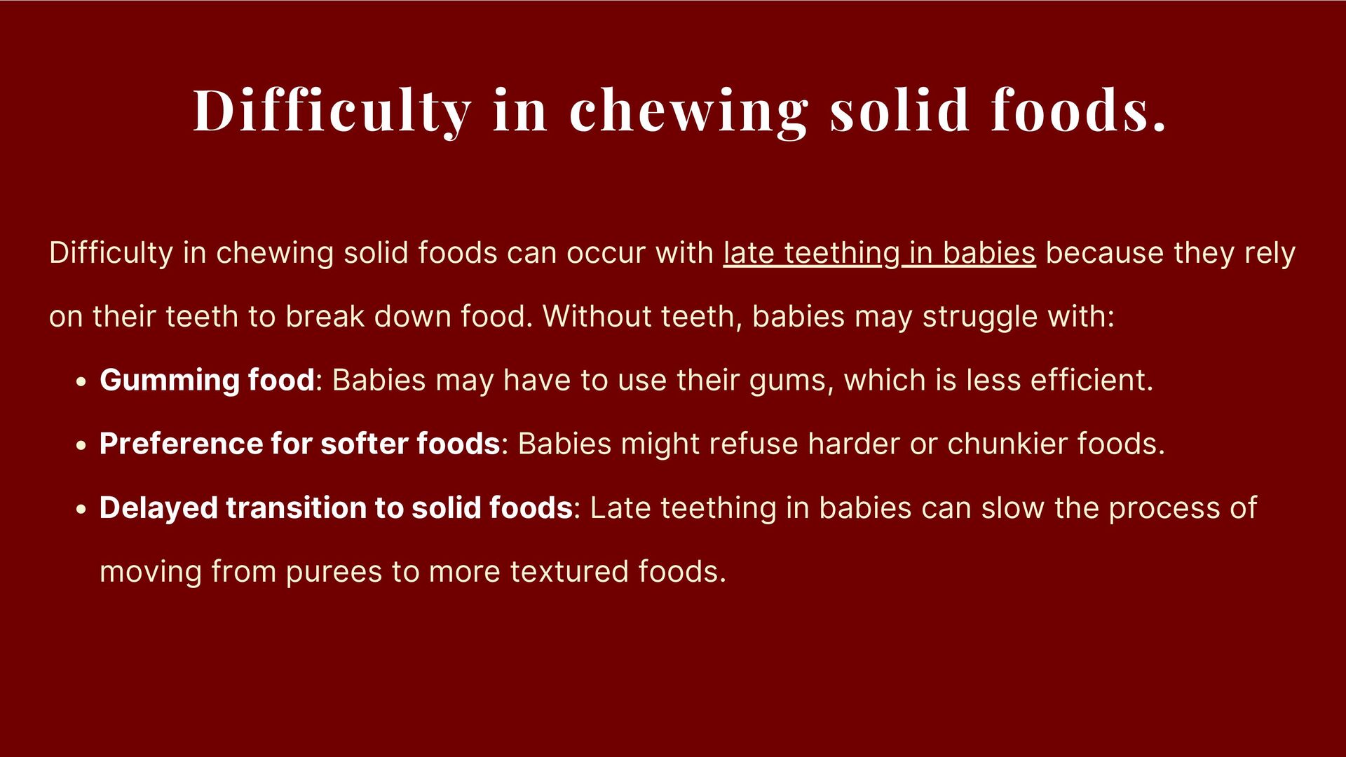 can occur with late teething in babies because they rely on their teeth to break down food. Without teeth, babies may struggle with: Gumming food: Babies may have to use their gums, which is less efficient. Preference for softer foods: Babies might refuse harder or chunkier foods. Delayed transition to solid foods: Late teething in babies can slow the process of moving from purees to more textured foods.