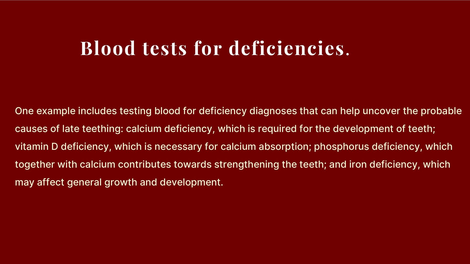 deficiency diagnoses that can help uncover the probable causes of late teething: calcium deficiency, which is required for the development of teeth; vitamin D deficiency, which is necessary for calcium absorption; phosphorus deficiency, which together with calcium contributes towards strengthening the teeth; and iron deficiency, which may affect general growth and development.
