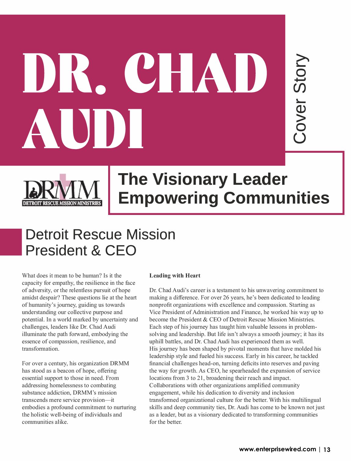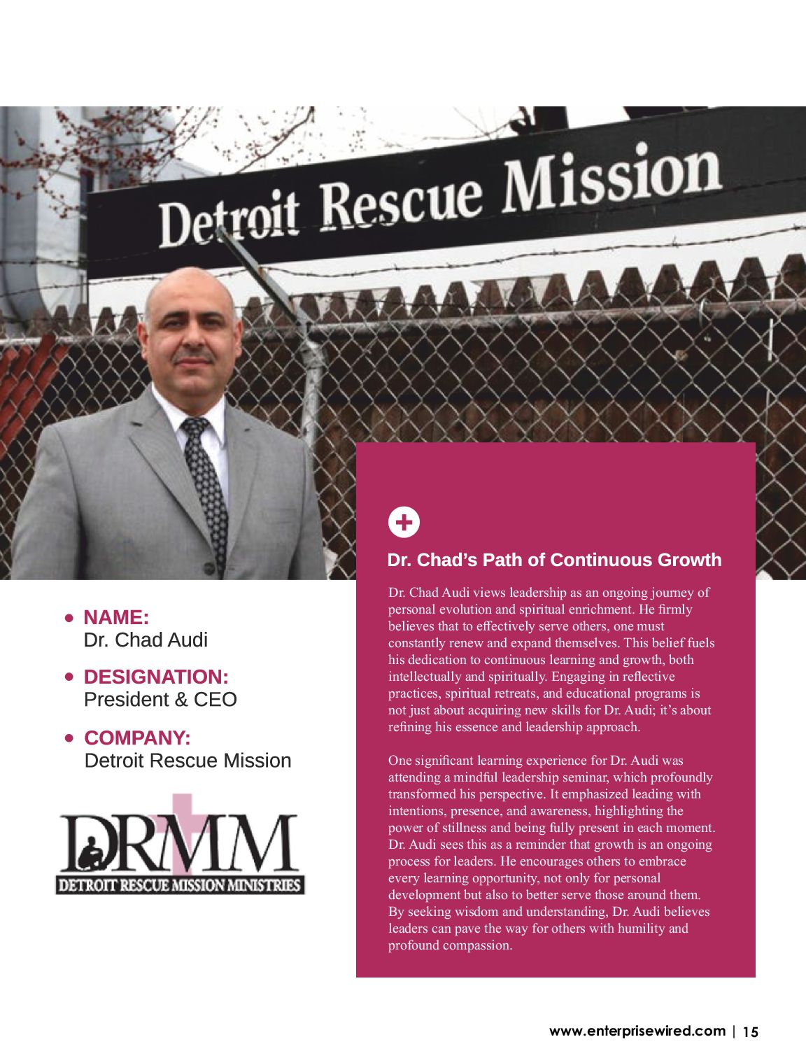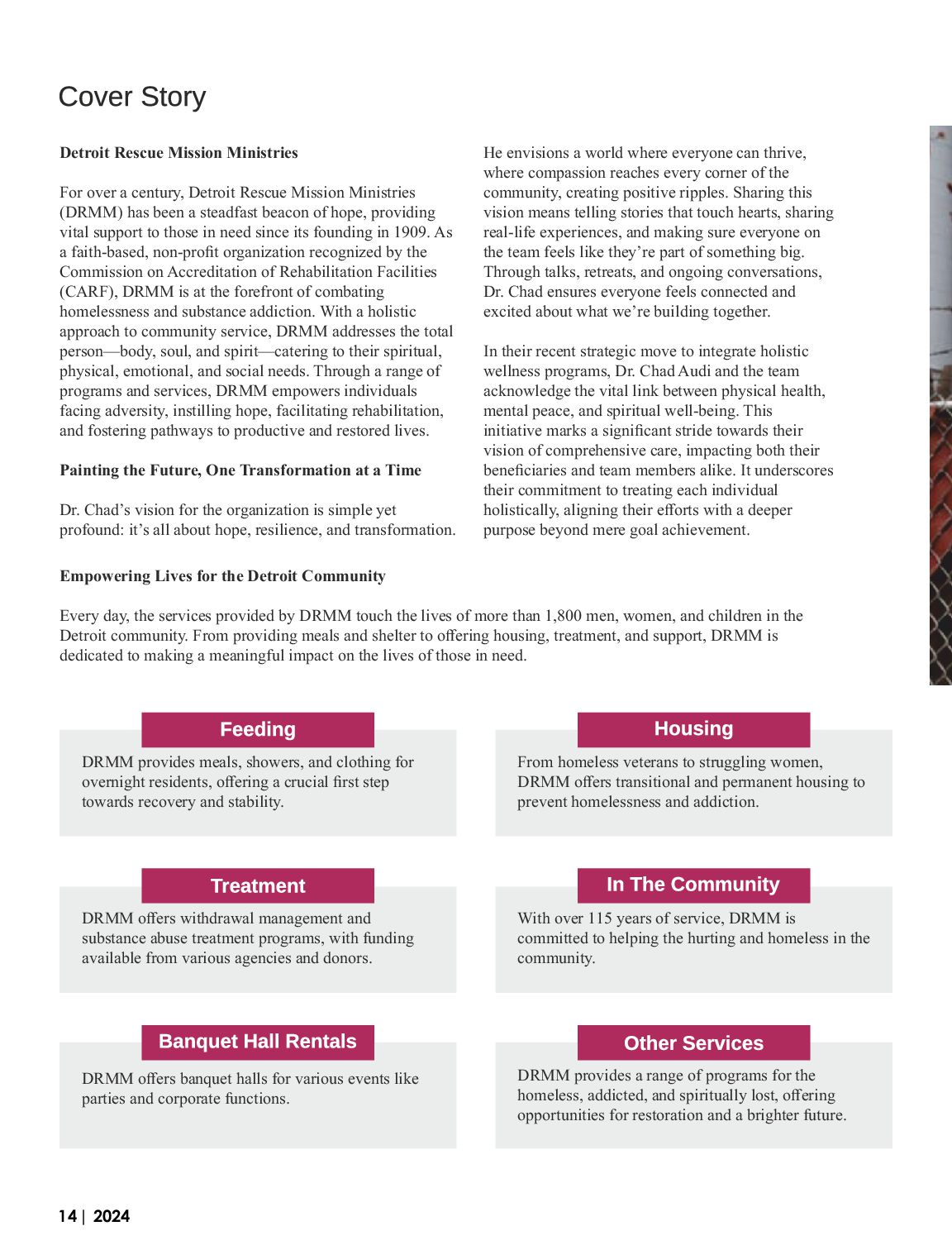 a crucial first step towards recovery and stability. From homeless veterans to struggling women, DRMM offers transitional and permanent housing to prevent homelessness and addiction. DRMM offers withdrawal management and substance abuse treatment programs, with funding available from various agencies and donors. With over 115 years of service, DRMM is committed to helping the hurting and homeless in the community. DRMM offers banquet halls for various events like parties and corporate functions. DRMM provides a range of programs for the homeless, addicted, and spiritually lost, offering opportunities for restoration and a brighter future. Detroit Rescue Mission Ministries For over a century, Detroit Rescue Mission Ministries (DRMM) has been a steadfast beacon of hope, providing vital support to those in need since its founding in 1909. As a faith-based, non-profit organization recognized by the Commission on Accreditation of Rehabilitation Facilities (CARF), DRMM is at the forefront of combating homelessness and substance addiction. With a holistic approach to community service, DRMM addresses the total person—body, soul, and spirit—catering to their spiritual, physical, emotional, and social needs. Through a range of programs and services, DRMM empowers individuals facing adversity, instilling hope, facilitating rehabilitation, and fostering pathways to productive and restored lives. Painting the Future, One Transformation at a Time Dr. Chad’s vision for the organization is simple yet profound: it’s all about hope, resilience, and transformation. He envisions a world where everyone can thrive, where compassion reaches every corner of the community, creating positive ripples. Sharing this vision means telling stories that touch hearts, sharing real-life experiences, and making sure everyone on the team feels like they’re part of something big. Through talks, retreats, and ongoing conversations, Dr. Chad ensures everyone feels connected and excited about what we’re building together. In their recent strategic move to integrate holistic wellness programs, Dr. Chad Audi and the team acknowledge the vital link between physical health, mental peace, and spiritual well-being. This initiative marks a significant stride towards their vision of comprehensive care, impacting both their beneficiaries and team members alike. It underscores their commitment to treating each individual holistically, aligning their efforts with a deeper purpose beyond mere goal achievement. Empowering Lives for the Detroit Community Every day, the services provided by DRMM touch the lives of more than 1,800 men, women, and children in the Detroit community. From providing meals and shelter to offering housing, treatment, and support, DRMM is dedicated to making a meaningful impact on the lives of those in need. | 2024 14