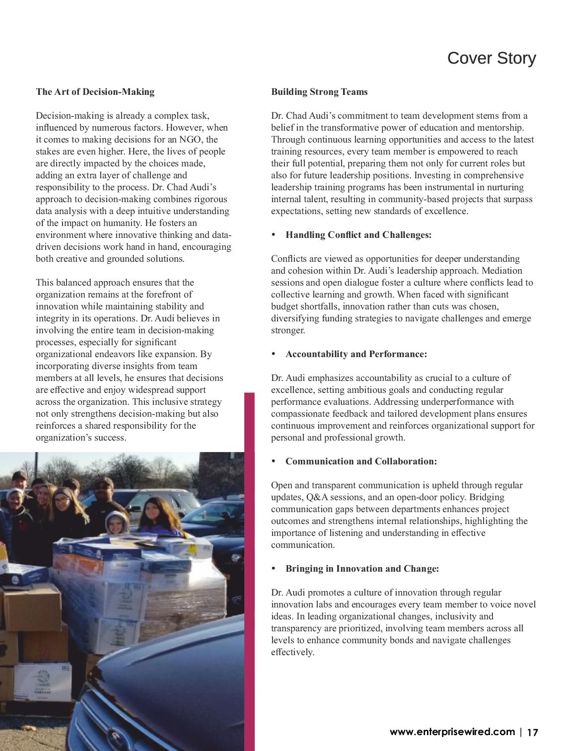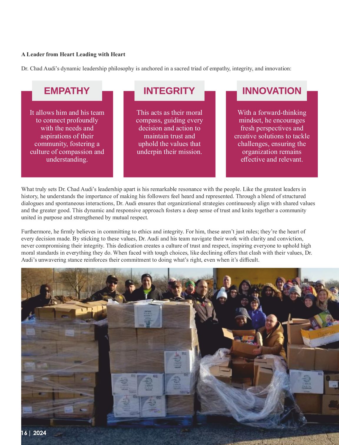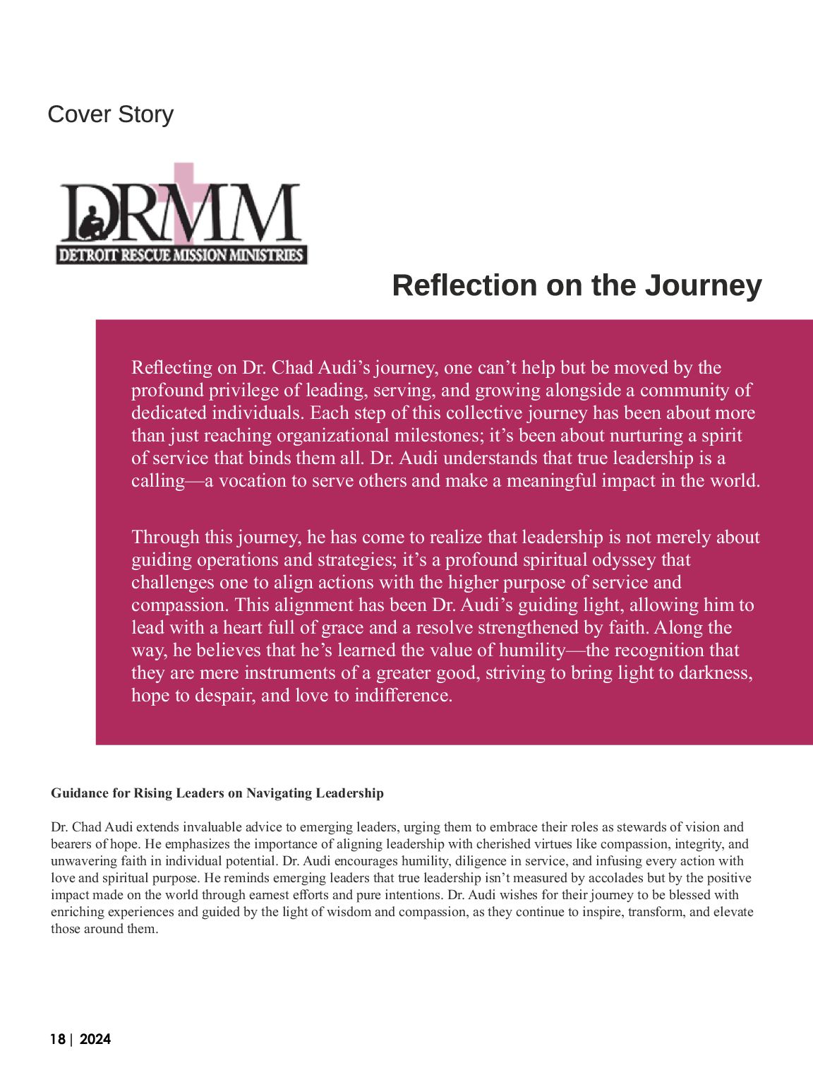 a crucial first step towards recovery and stability. From homeless veterans to struggling women, DRMM offers transitional and permanent housing to prevent homelessness and addiction. DRMM offers withdrawal management and substance abuse treatment programs, with funding available from various agencies and donors. With over 115 years of service, DRMM is committed to helping the hurting and homeless in the community. DRMM offers banquet halls for various events like parties and corporate functions. DRMM provides a range of programs for the homeless, addicted, and spiritually lost, offering opportunities for restoration and a brighter future. Detroit Rescue Mission Ministries For over a century, Detroit Rescue Mission Ministries (DRMM) has been a steadfast beacon of hope, providing vital support to those in need since its founding in 1909. As a faith-based, non-profit organization recognized by the Commission on Accreditation of Rehabilitation Facilities (CARF), DRMM is at the forefront of combating homelessness and substance addiction. With a holistic approach to community service, DRMM addresses the total person—body, soul, and spirit—catering to their spiritual, physical, emotional, and social needs. Through a range of programs and services, DRMM empowers individuals facing adversity, instilling hope, facilitating rehabilitation, and fostering pathways to productive and restored lives. Painting the Future, One Transformation at a Time Dr. Chad’s vision for the organization is simple yet profound: it’s all about hope, resilience, and transformation. He envisions a world where everyone can thrive, where compassion reaches every corner of the community, creating positive ripples. Sharing this vision means telling stories that touch hearts, sharing real-life experiences, and making sure everyone on the team feels like they’re part of something big. Through talks, retreats, and ongoing conversations, Dr. Chad ensures everyone feels connected and excited about what we’re building together. In their recent strategic move to integrate holistic wellness programs, Dr. Chad Audi and the team acknowledge the vital link between physical health, mental peace, and spiritual well-being. This initiative marks a significant stride towards their vision of comprehensive care, impacting both their beneficiaries and team members alike. It underscores their commitment to treating each individual holistically, aligning their efforts with a deeper purpose beyond mere goal achievement. Empowering Lives for the Detroit Community Every day, the services provided by DRMM touch the lives of more than 1,800 men, women, and children in the Detroit community. From providing meals and shelter to offering housing, treatment, and support, DRMM is dedicated to making a meaningful impact on the lives of those in need. | 2024 14