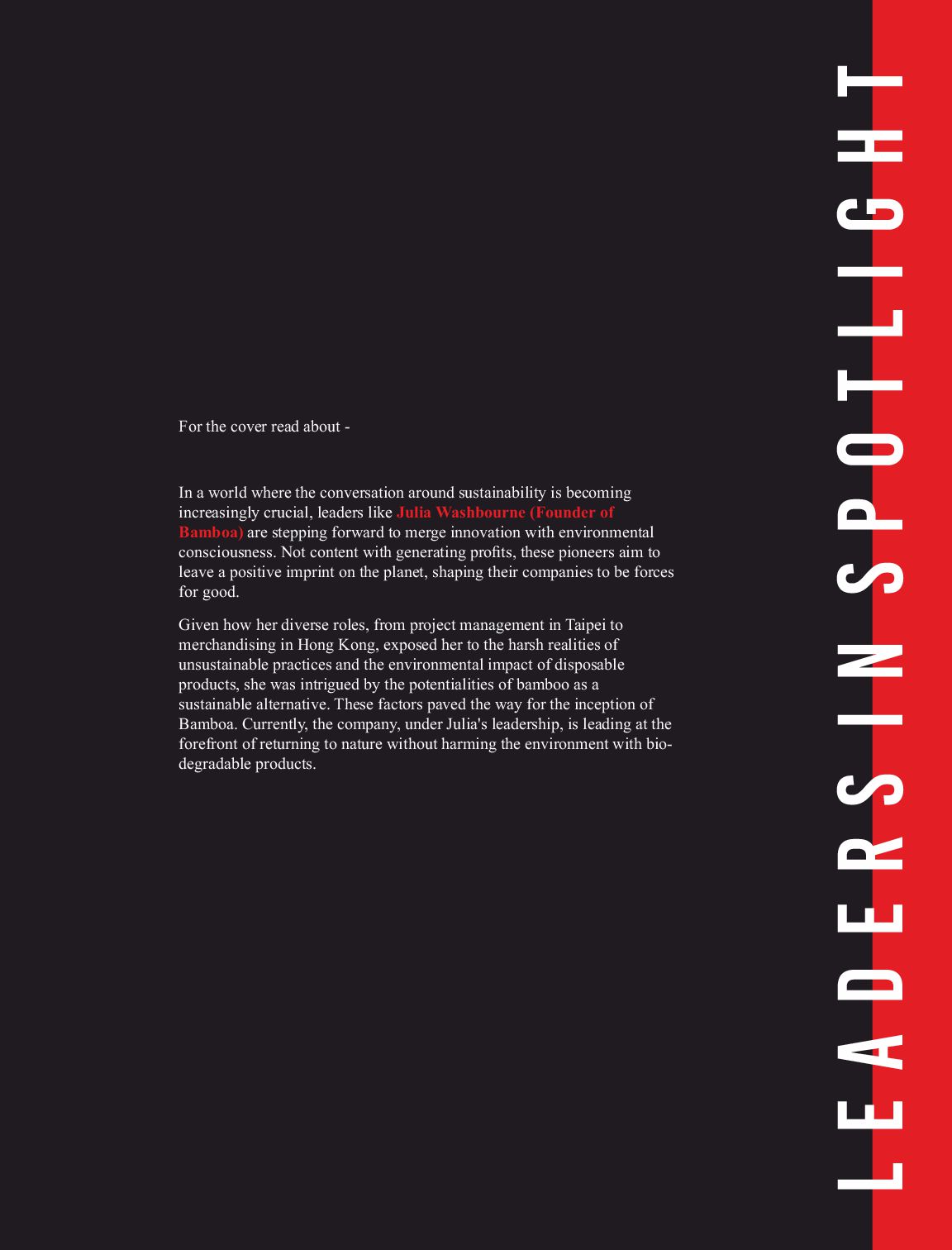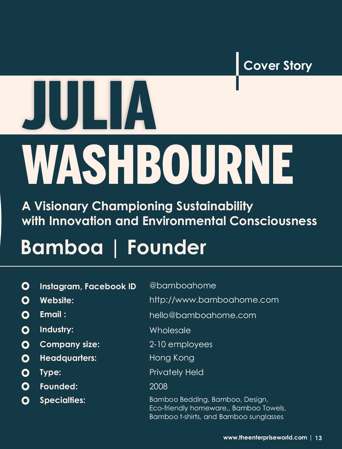 increasingly crucial, leaders like Julia Washbourne (Founder of Bamboa) are stepping forward to merge innovation with environmental consciousness. Not content with generating profits, these pioneers aim to leave a positive imprint on the planet, shaping their companies to be forces for good. Given how her diverse roles, from project management in Taipei to merchandising in Hong Kong, exposed her to the harsh realities of unsustainable practices and the environmental impact of disposable products, she was intrigued by the potentialities of bamboo as a sustainable alternative. These factors paved the way for the inception of Bamboa. Currently, the company, under Julia's leadership, is leading at the forefront of returning to nature without harming the environment with bio-degradable products. A Profound Interest in Sustainability A British/German entrepreneur with a rich background in Chinese studies, Julia embarked on her sustainable journey in 1996 by moving to China. She pursued her master's degree in Chinese studies in Germany, a choice that reflected her unique heritage of being both English and German. This academic journey led her to China in 1996, where she spent a year studying at a university. Following her degree, Julia's career began in Taipei, where she assumed the role of project manager in electronics for an American company. Her professional path then took her to Hong Kong as a merchandising manager. In this capacity, she oversaw the purchasing department for homeware products, engaging in quality control and product development. She was responsible for sourcing new products by attending various shows and visiting factories across China. During these visits to numerous factories in China, she became acutely aware of the detrimental impact of unsustainable practices on the environment. She observed the vast amounts of plastic and disposable items being produced and sold, often used briefly before being discarded. This experience was pivotal, sparking a deep interest in sustainable materials, particularly when she encountered products made from bamboo, such as bamboo socks and towels. Fascinated by the potential of bamboo as a sustainable resource, Julia dedicated herself to extensive research on the subject, marking the beginning of her mission to promote bamboo as an eco-friendly alternative. Driven by a commitment to sustainability, Julia founded her company, focusing on designing and developing everyday necessities made from bamboo. She concentrated on products like bamboo bedsheets, towels, and T-shirts, emphasizing their antibacterial properties, breathability, and suitability for individuals with skin allergies due to the hypoallergenic nature of bamboo fiber. Julia was captivated by the fabric's benefits, likening it to vegan silk for its silky soft texture that does not require fabric softener and is machine washable, contrasting with the delicate nature of silk. This distinction highlighted bamboo fabric's durability, solidifying her decision to champion bamboo as a cornerstone of her company's product line. Moreover, she has become a bamboo expert and for any enquiries, can be contacted at