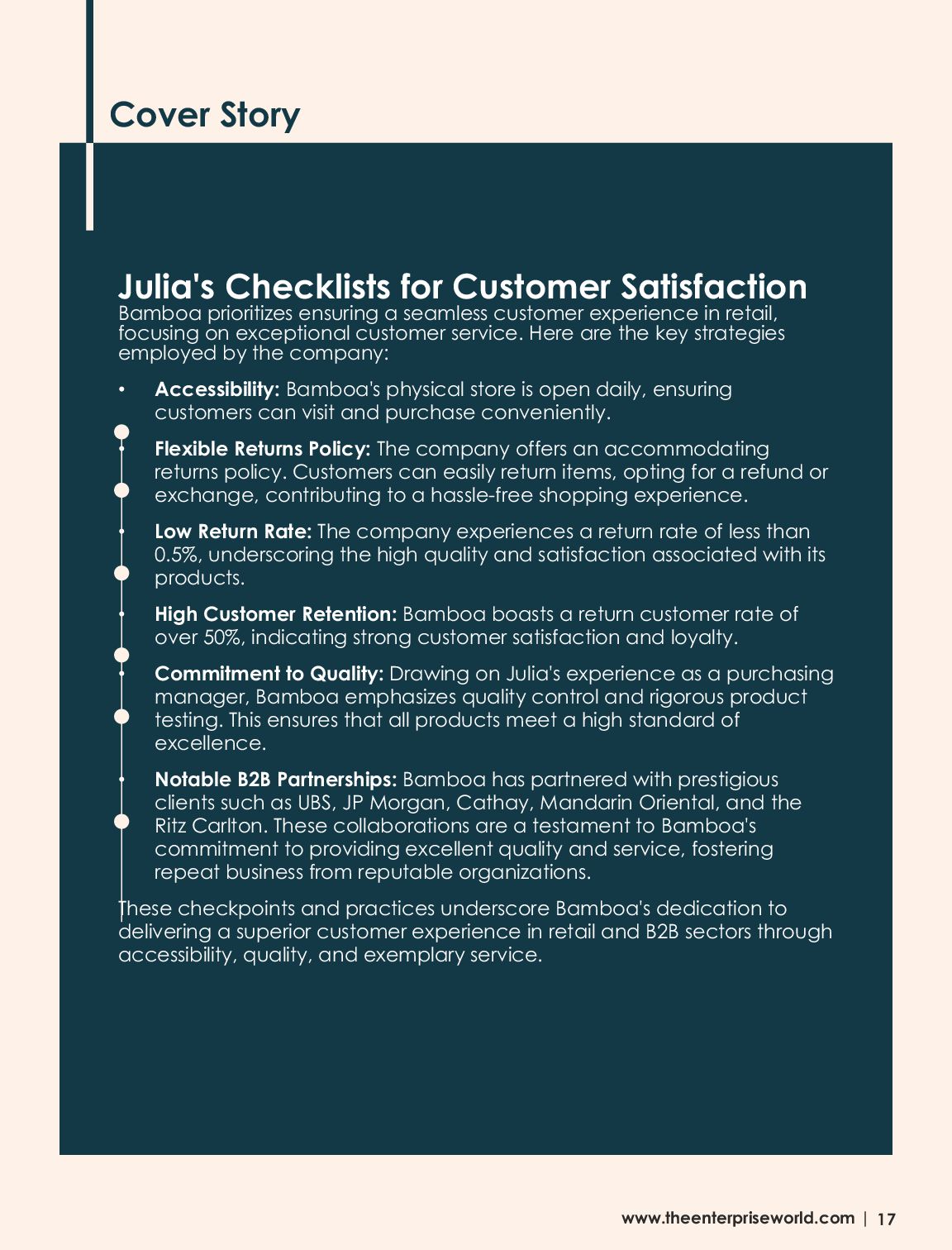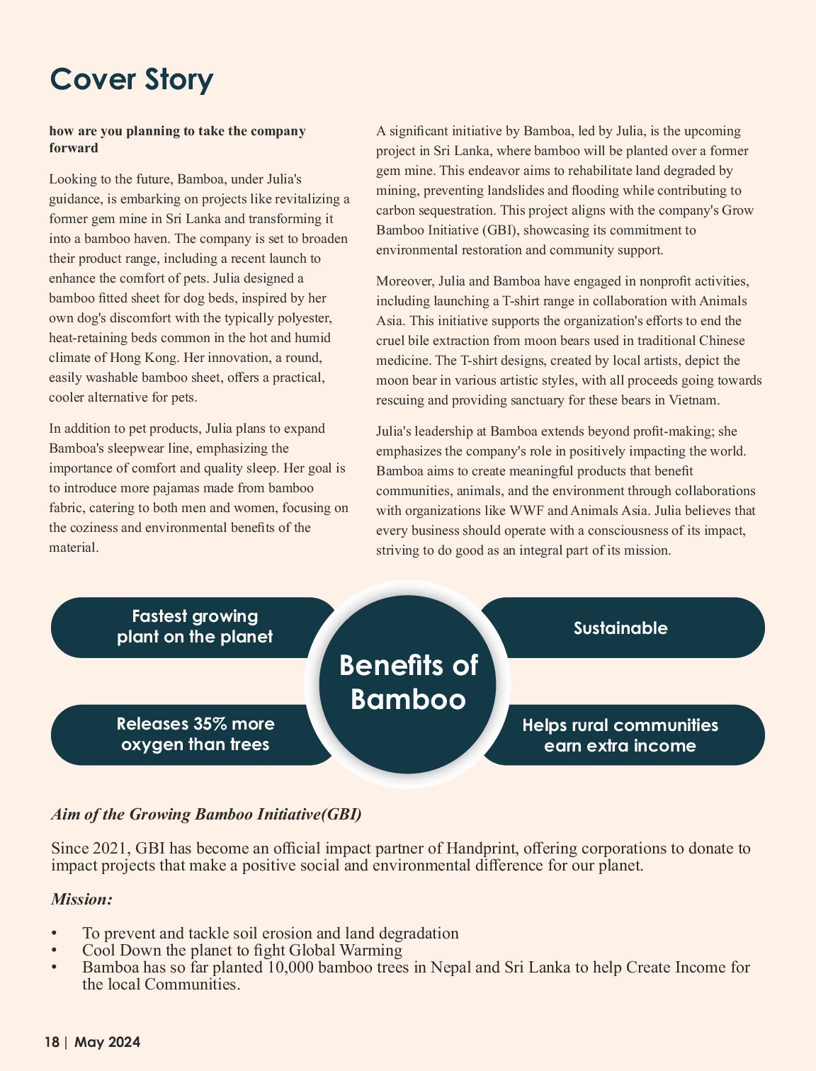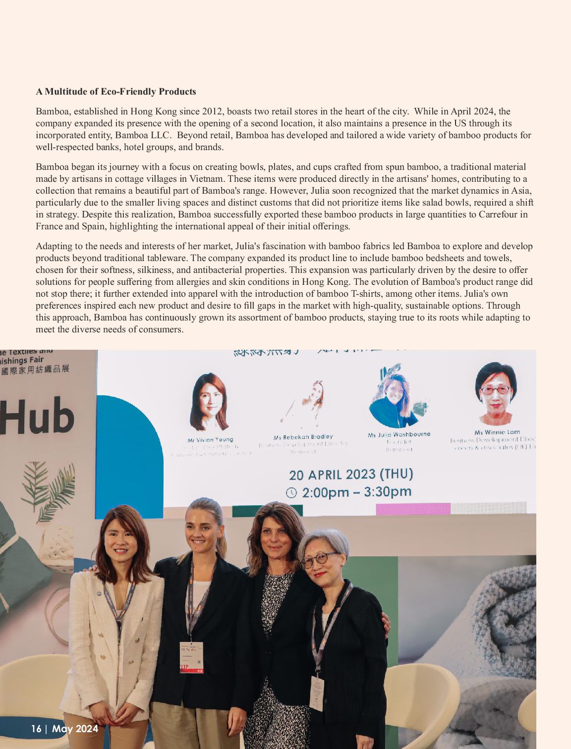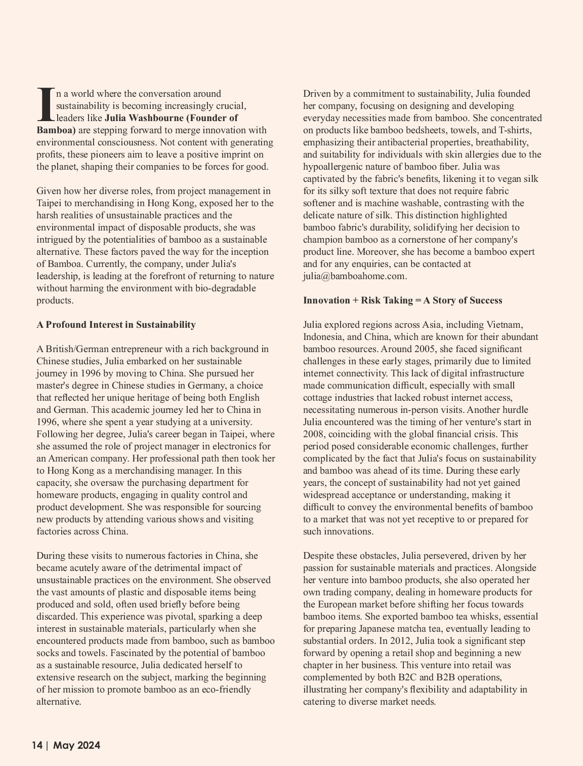[email protected]. Innovation + Risk Taking = A Story of Success Julia explored regions across Asia, including Vietnam, Indonesia, and China, which are known for their abundant bamboo resources. Around 2005, she faced significant challenges in these early stages, primarily due to limited internet connectivity. This lack of digital infrastructure made communication difficult, especially with small cottage industries that lacked robust internet access, necessitating numerous in-person visits. Another hurdle Julia encountered was the timing of her venture's start in 2008, coinciding with the global financial crisis. This period posed considerable economic challenges, further complicated by the fact that Julia's focus on sustainability and bamboo was ahead of its time. During these early years, the concept of sustainability had not yet gained widespread acceptance or understanding, making it difficult to convey the environmental benefits of bamboo to a market that was not yet receptive to or prepared for such innovations. Despite these obstacles, Julia persevered, driven by her passion for sustainable materials and practices. Alongside her venture into bamboo products, she also operated her own trading company, dealing in homeware products for the European market before shifting her focus towards bamboo items. She exported bamboo tea whisks, essential for preparing Japanese matcha tea, eventually leading to substantial orders. In 2012, Julia took a significant step forward by opening a retail shop and beginning a new chapter in her business. This venture into retail was complemented by both B2C and B2B operations, illustrating her company's flexibility and adaptability in catering to diverse market needs. | May 2024 14