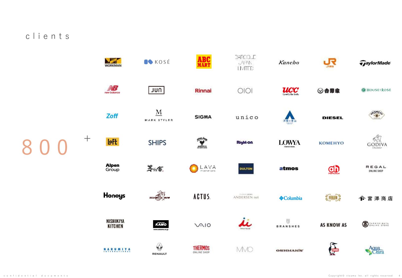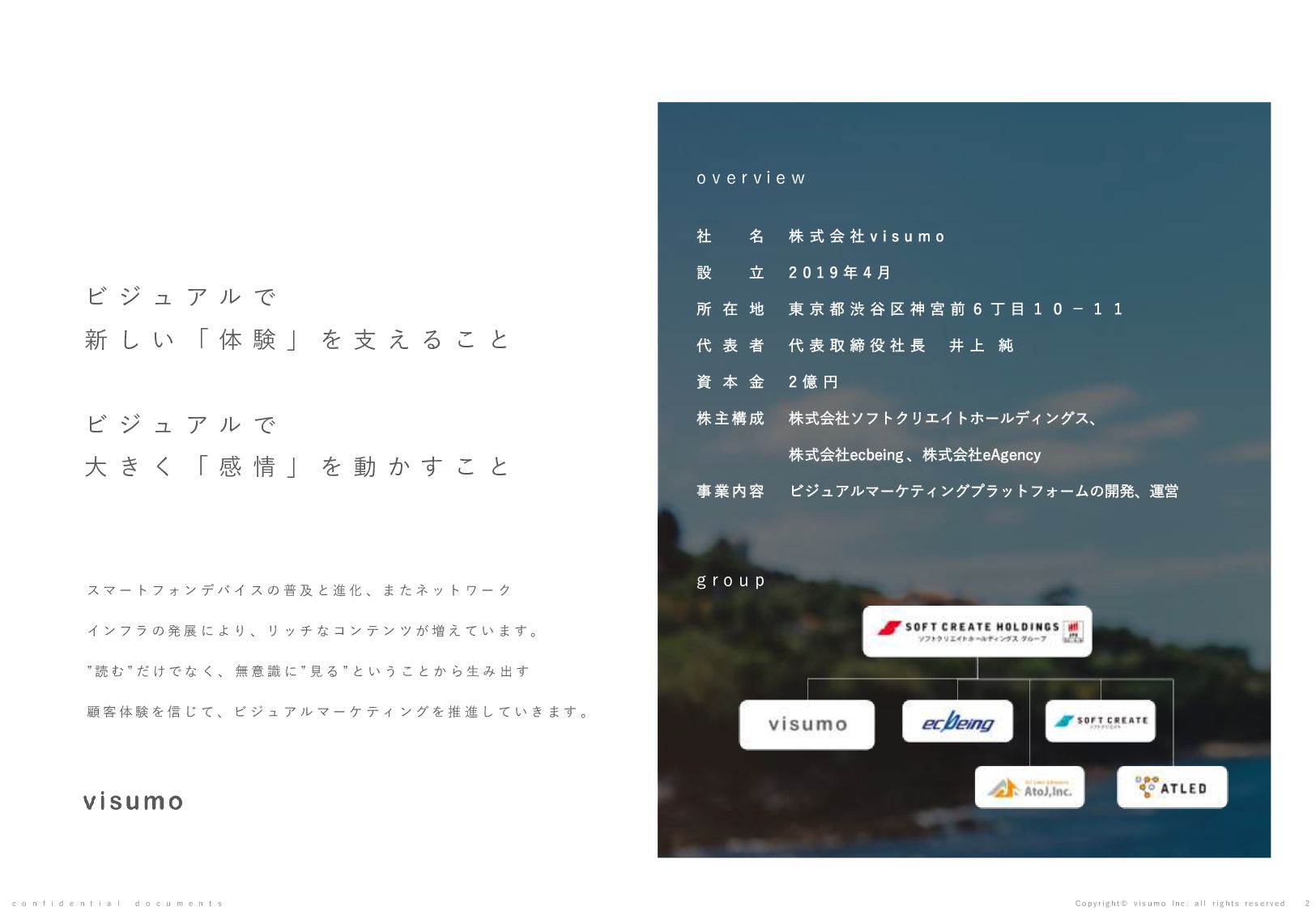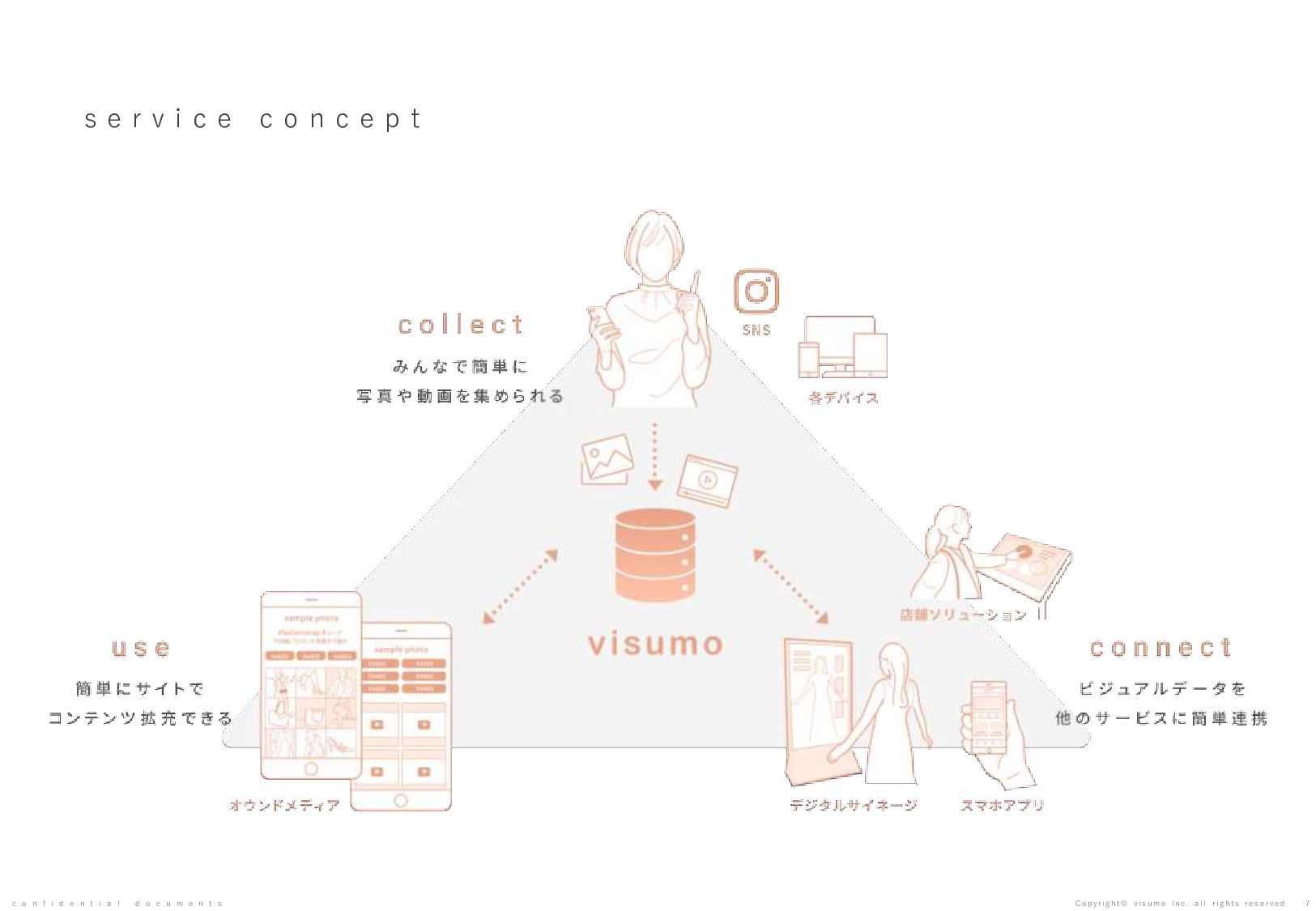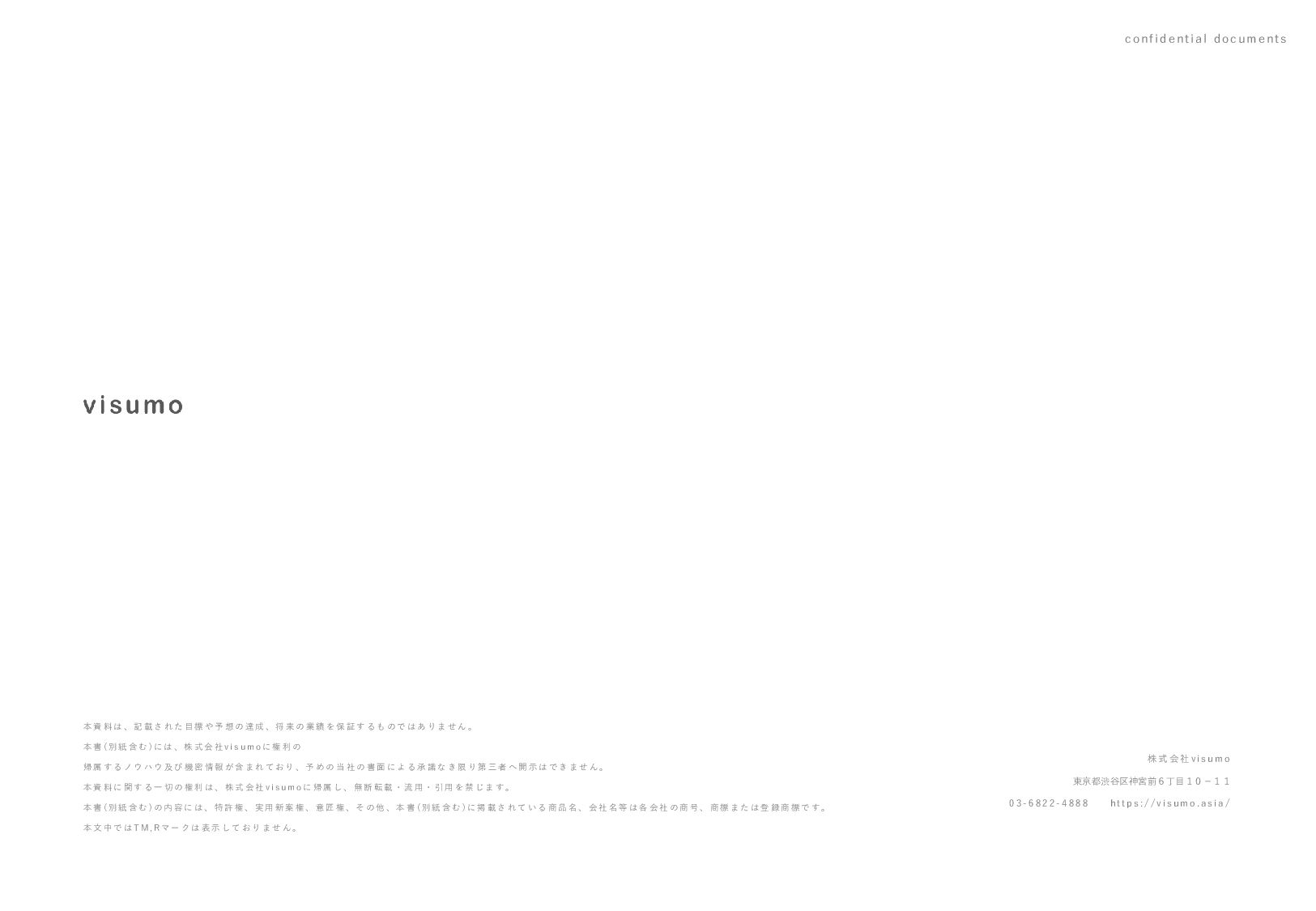 目 標 や 予 想 の 達 成 、 将 来 の 業 績 を 保 証 す る も の で は あ り ま せ ん 。 本 書 ( 別 紙 含 む ) に は 、 株 式 会 社 v i s u m o に 権 利 の 帰 属 す る ノ ウ ハ ウ 及 び 機 密 情 報 が 含 ま れ て お り 、 予 め の 当 社 の 書 面 に よ る 承 諾 な き 限 り 第 三 者 へ 開 示 は で き ま せ ん 。 本 資 料 に 関 す る 一 切 の 権 利 は 、 株 式 会 社 v i s u m o に 帰 属 し 、 無 断 転 載 ・ 流 用 ・ 引 用 を 禁 じ ま す 。 本 書 ( 別 紙 含 む ) の 内 容 に は 、 特 許 権 、 実 用 新 案 権 、 意 匠 権 、 そ の 他 、 本 書 ( 別 紙 含 む ) に 掲 載 さ れ て い る 商 品 名 、 会 社 名 等 は 各 会 社 の 商 号 、 商 標 ま た は 登 録 商 標 で す 。 本 文 中 で は T M , R マ ー ク は 表 示 し て お り ま せ ん 。 株 式 会 社 v i s u m o 東京都渋谷区神宮前6丁目10−11 0 3 - 6 8 2 2 - 4 8 8 8 h t t p s : / / v i s u m o . a s i a / confidential documents