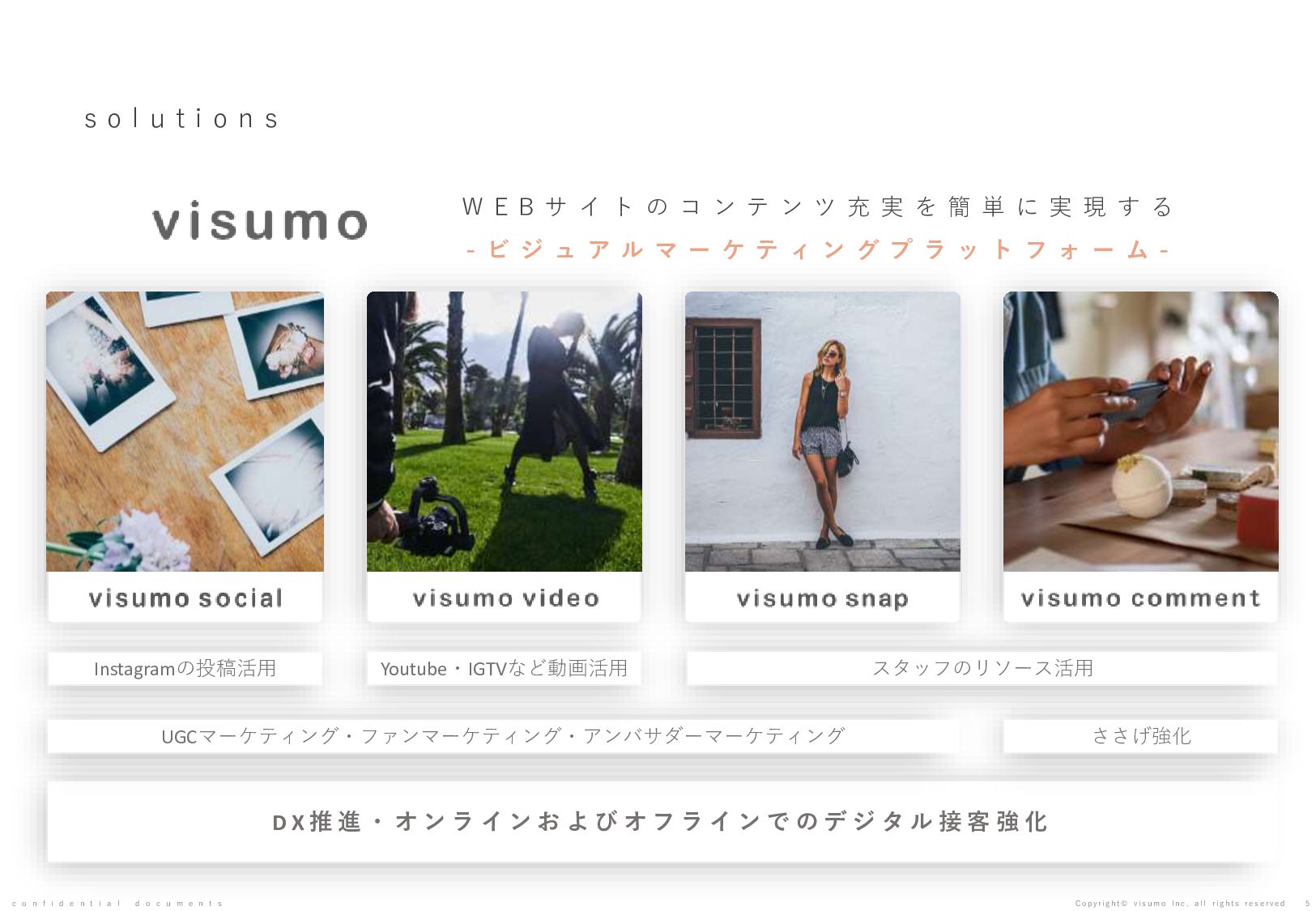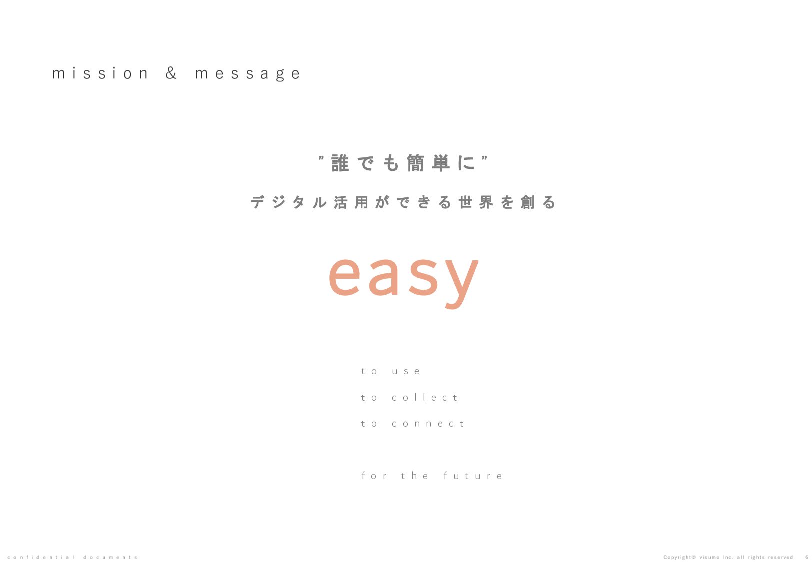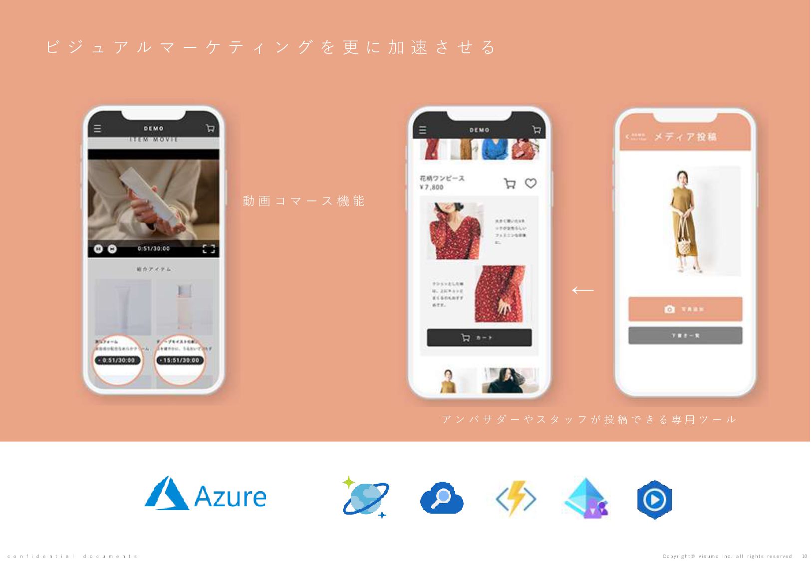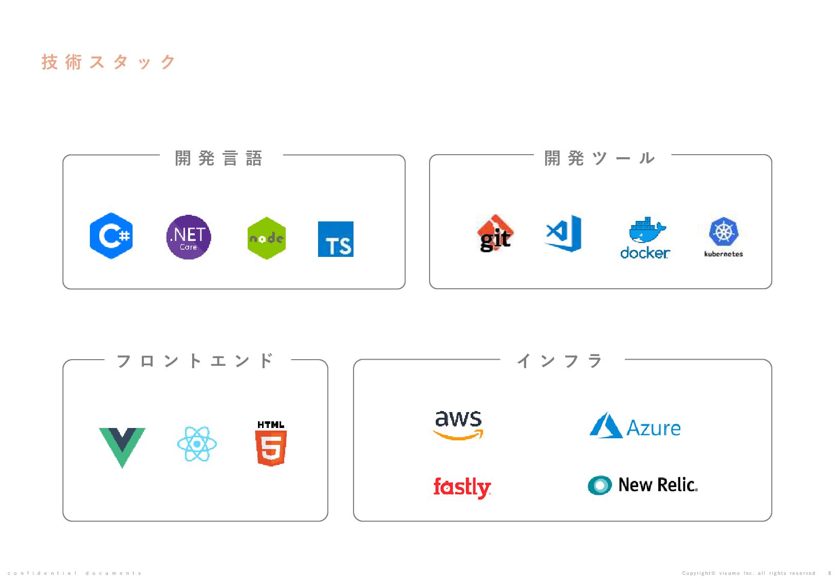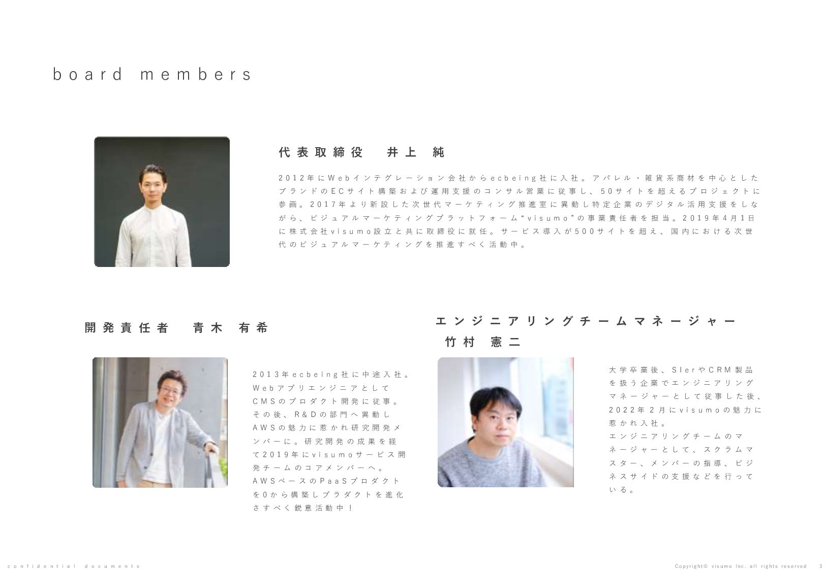 目 標 や 予 想 の 達 成 、 将 来 の 業 績 を 保 証 す る も の で は あ り ま せ ん 。 本 書 ( 別 紙 含 む ) に は 、 株 式 会 社 v i s u m o に 権 利 の 帰 属 す る ノ ウ ハ ウ 及 び 機 密 情 報 が 含 ま れ て お り 、 予 め の 当 社 の 書 面 に よ る 承 諾 な き 限 り 第 三 者 へ 開 示 は で き ま せ ん 。 本 資 料 に 関 す る 一 切 の 権 利 は 、 株 式 会 社 v i s u m o に 帰 属 し 、 無 断 転 載 ・ 流 用 ・ 引 用 を 禁 じ ま す 。 本 書 ( 別 紙 含 む ) の 内 容 に は 、 特 許 権 、 実 用 新 案 権 、 意 匠 権 、 そ の 他 、 本 書 ( 別 紙 含 む ) に 掲 載 さ れ て い る 商 品 名 、 会 社 名 等 は 各 会 社 の 商 号 、 商 標 ま た は 登 録 商 標 で す 。 本 文 中 で は T M , R マ ー ク は 表 示 し て お り ま せ ん 。 株 式 会 社 v i s u m o 東京都渋谷区神宮前6丁目10−11 0 3 - 6 8 2 2 - 4 8 8 8 h t t p s : / / v i s u m o . a s i a / confidential documents