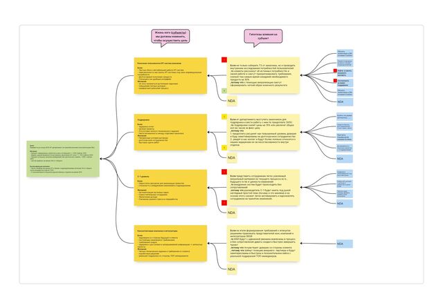 P&L Метрики: Процент завершенных проектов в срок и в бюджете 50% (сейчас 10% Индекс удовлетворенности внутренних заказчиков ИТ-услуг 75% (сейчас 40% Процент успешных релизов (внедрений) без критических ошибок 90% сейчас 34% - чистая прибыль не менее 10% от оборота Балансирующие метрики: - Число конфликтов между ИТ и бизнес-подразделениями не более 5% от общего числа инцидентов (сейчас 15% % сэкономленного бюджета дружественных отделов не менее 20% Конечные пользователи ИТ-систем компании Боли: Частые сбои и нестабильная работа ИТ-систем Невозможность настроить ИТ-системы под свои индивидуальные потребности Долгое время получение продукта Сложный и не удобный интерфейс Желания: - не хочу заниматься рутинными задачами - повышение личных доходов - - комфортный рабочиий процесс Подрядчики Боли: - задержка оплат - мелкие проекты Отсутствие четкого технического задания Несогласованность между отделами заказчика Желания: Прозрачные условия договора - долгосрочное сотрудничество - быстрые сдачи работ Консалтинговые компании и интеграторы Боли: - недоверие со стороны будущего клиента - постоянные изменения в требованиях - требования скидок - задержки с доступами и запрашиваемой информации → затянутые проекты Желания: Четкое техническое задание и требования от клиента - коробочные решения - реальная поддержка со стороны ТОП-менеджмента С 1 уровень Боли: Недостаток ресурсов для реализации проектов Сложности с внедрением изменений в подразделении - Желания: Автоматизация рутинных задач Самостоятельные сотрудники Увеличение дохода Снижение уровня стресса и переработок Если не только собирать ТЗ от заказчика, но и проводить внутренние исследования потребностей пользователей ,то клиенты расскажут об истинных потребностях и своей работе и смогут приоритизировать требования, снижая тем самым время ожидания необходимого продукта на 30% ,потому что с помощью визуализации смогут сформировать четкий образ конечного результата Если ит-департаменту выступать заказчиком для подрядчика и вести работу с ним по предоплате 30% ,то подрядчики снизят цены на 15% или увеличат общее кол-во часов за фикс цену ,потому что 1. предоплату расценят как повышенный уровень доверия и буду замотивированы на долгосрочное сотрудничество 2. увидят в нас коллег и будут более лояльно относится к нашим задержкам из-за несогласованности внутри отделов Если представить сотрудникам легко усвояемый визуальный материал их текущего процесса as is , будущего to be и ценности изменений ,то внедрение систем будет происходить без сопротивлений ,потому что руководитель С 1 будет иметь под рукой наглядный простой план (почему и что меняем) и на основе этого сможет легко мотивировать и вдохновлять сотрудников на принятие изменений. Если на этапе формирования требований к enterprise решениям привлекать представителей конс.компаний и интеграторов ККИ ,то ККИ будут с удвоенной рвением вовлечены в процесс и без сопротивления давать скидки и быстрее завершать проект ,потому что почувствуют доверие со стороны клиента , потому что займут позицию внешнего партнера и будут заинтересованы в быстром и положительном кейсе с реальной поддержкой ТОП-менеджеров. Обучить аналитиков и PM основам CustDev Найти и нанять внешнего эксперта Обучить аналитиков и PM основам CustDev Провести вводные встречи с бизнес- подр