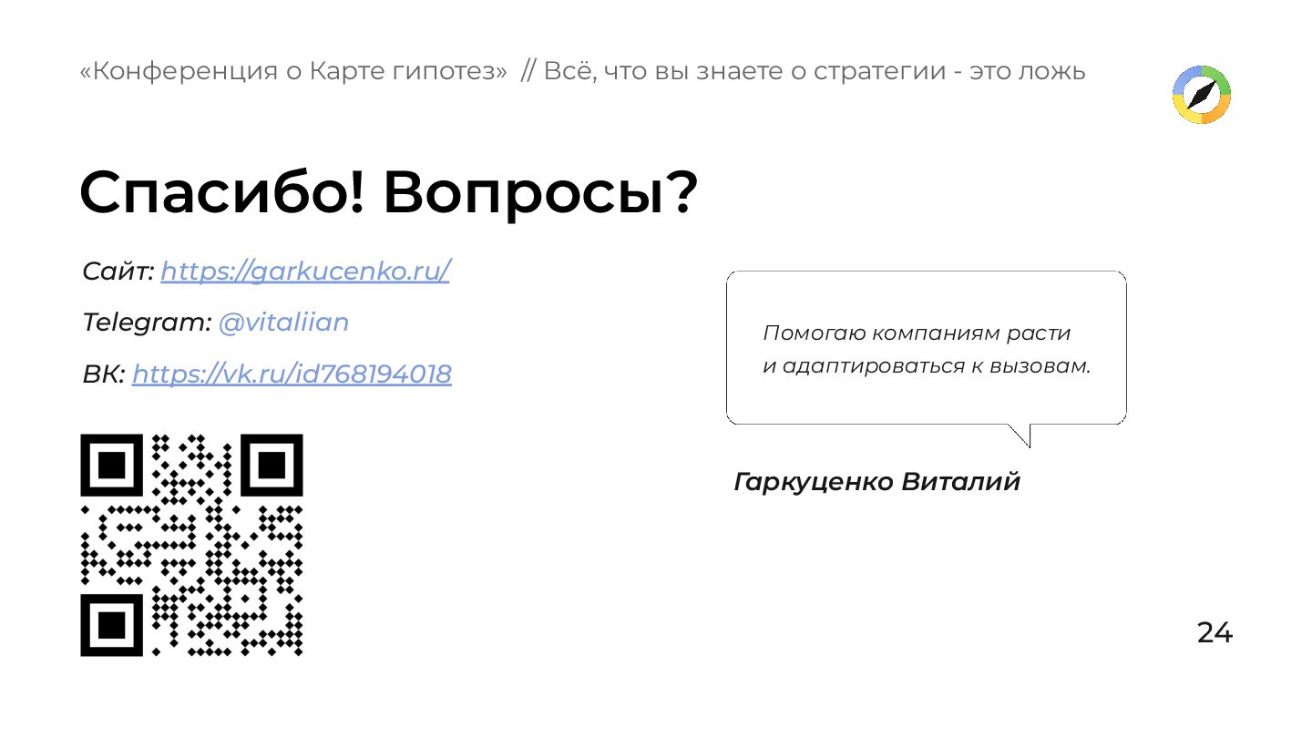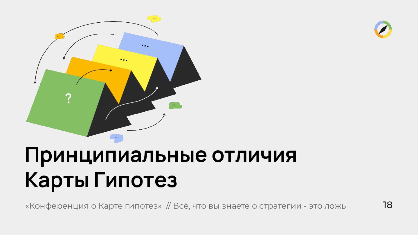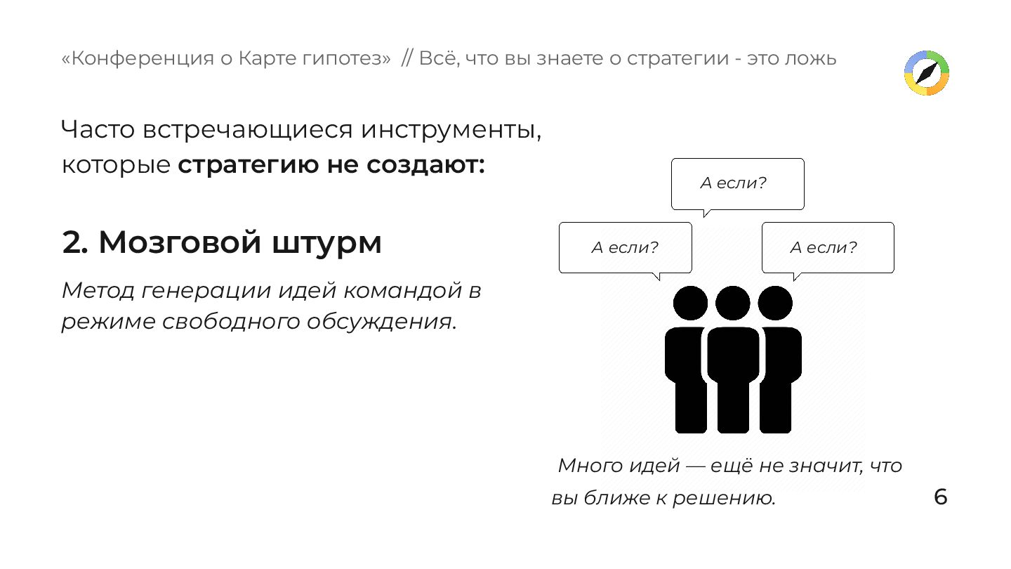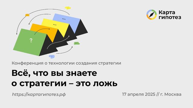 свободного обсуждения. «Конференция о Карте гипотез» // Всё, что вы знаете о стратегии - это ложь Много идей — ещё не значит, что вы ближе к решению. А если? А если? А если? Часто встречающиеся инструменты, которые стратегию не создают: