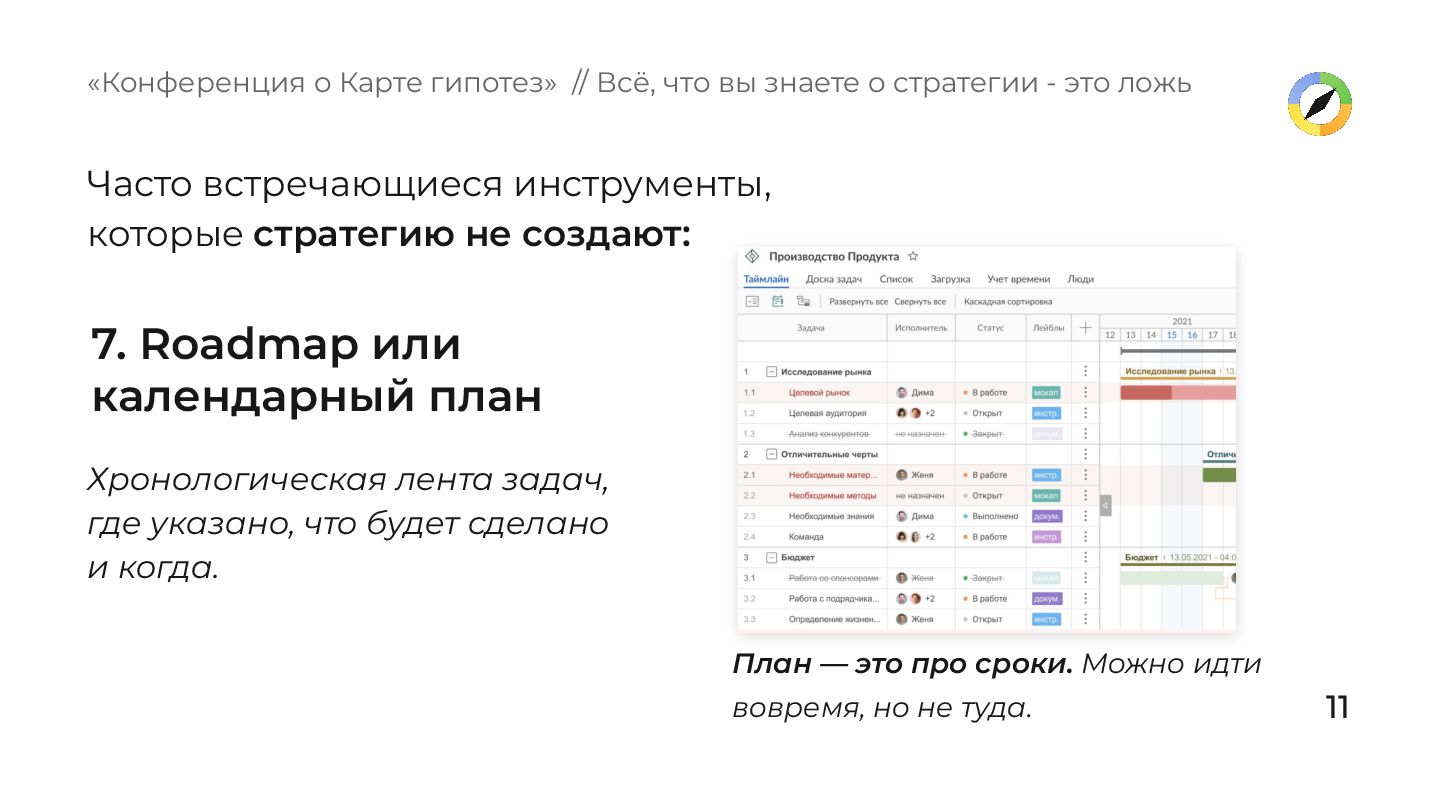 указано, что будет сделано и когда. «Конференция о Карте гипотез» // Всё, что вы знаете о стратегии - это ложь План — это про сроки. Можно идти вовремя, но не туда. Часто встречающиеся инструменты, которые стратегию не создают: