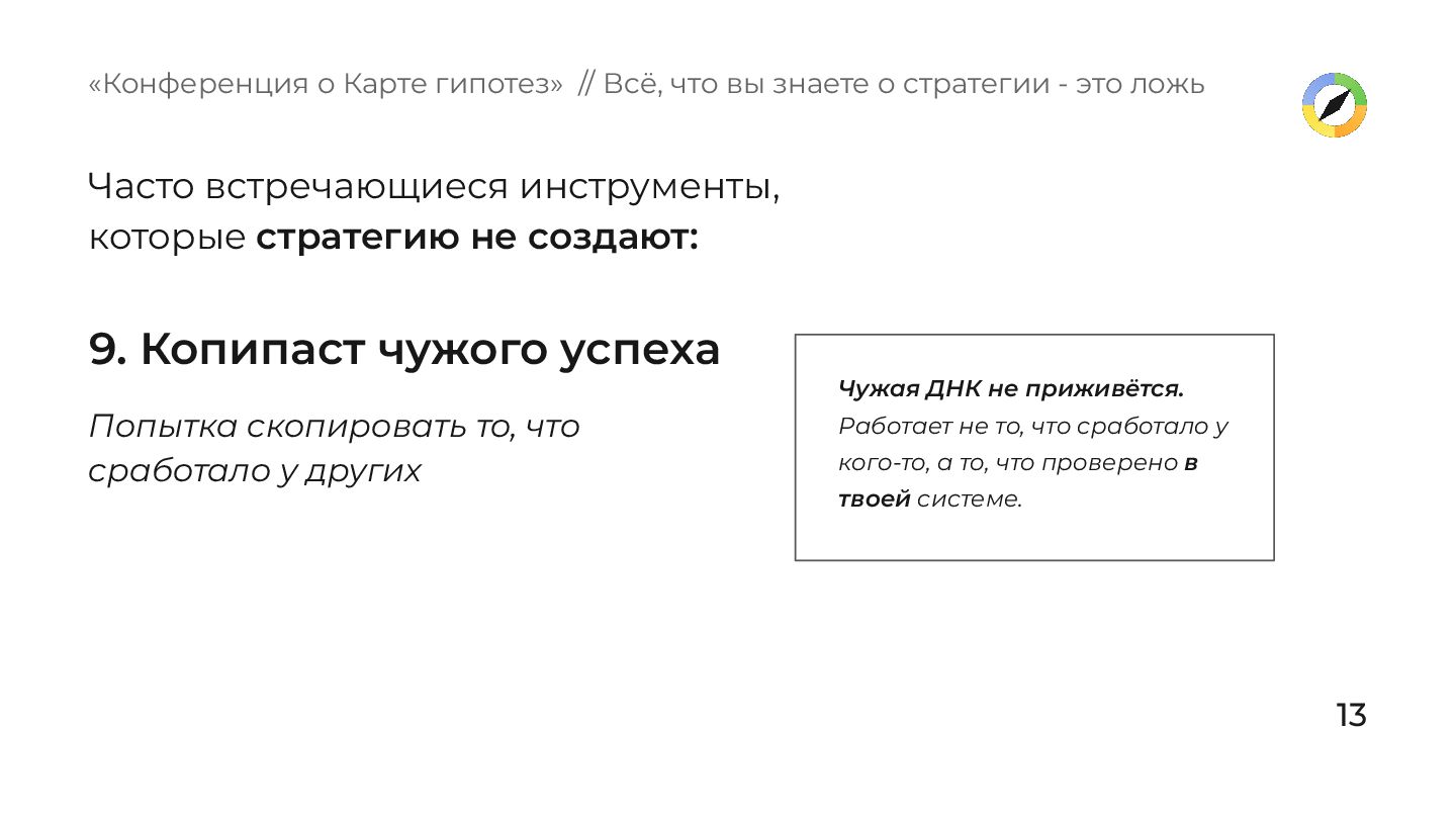 у других Чужая ДНК не приживётся. Работает не то, что сработало у кого-то, а то, что проверено в твоей системе. «Конференция о Карте гипотез» // Всё, что вы знаете о стратегии - это ложь Часто встречающиеся инструменты, которые стратегию не создают: