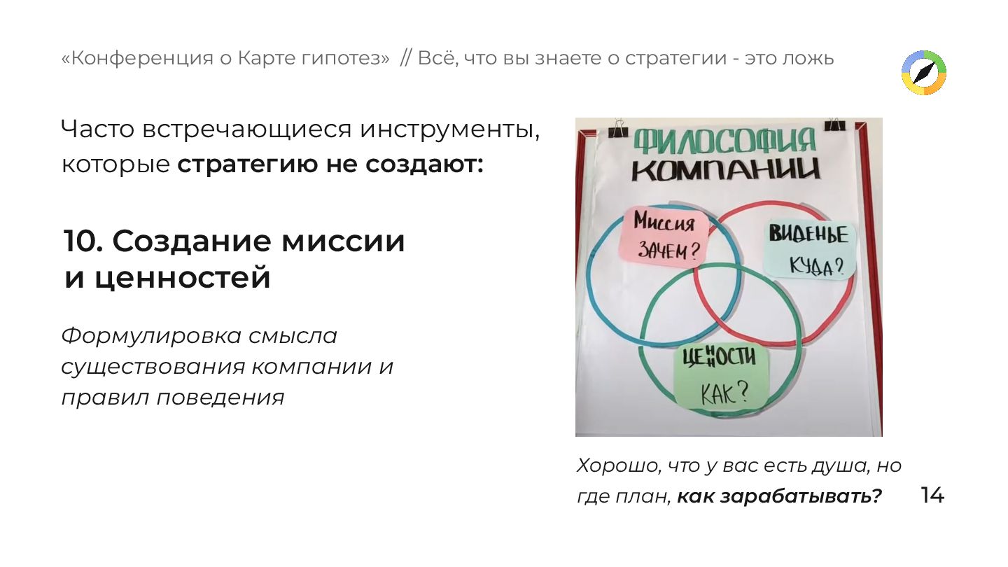 и правил поведения «Конференция о Карте гипотез» // Всё, что вы знаете о стратегии - это ложь Хорошо, что у вас есть душа, но где план, как зарабатывать? Часто встречающиеся инструменты, которые стратегию не создают: