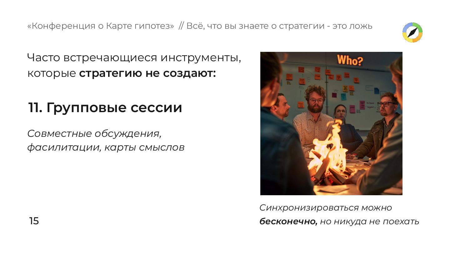 о Карте гипотез» // Всё, что вы знаете о стратегии - это ложь Синхронизироваться можно бесконечно, но никуда не поехать Часто встречающиеся инструменты, которые стратегию не создают: