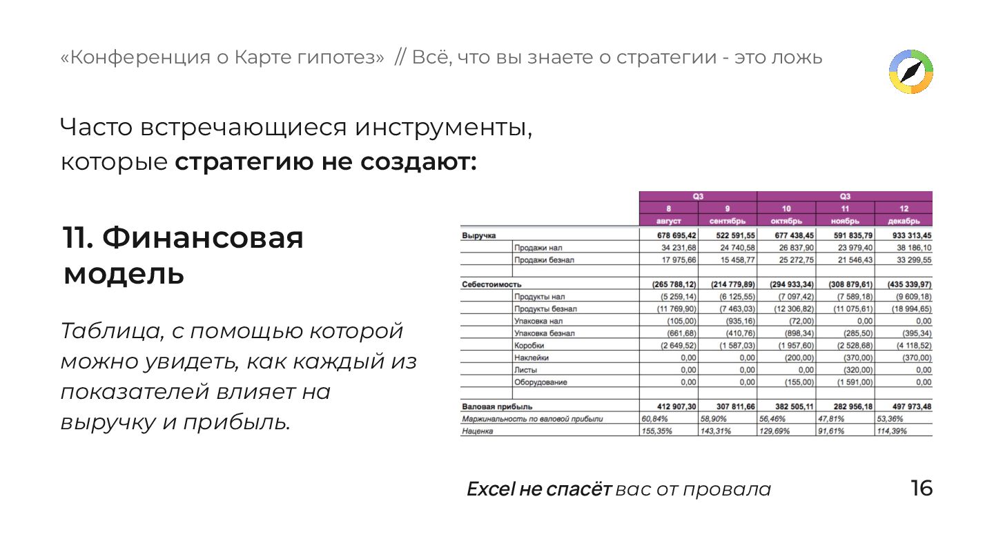 как каждый из показателей влияет на выручку и прибыль. «Конференция о Карте гипотез» // Всё, что вы знаете о стратегии - это ложь Excel не спасёт вас от провала Часто встречающиеся инструменты, которые стратегию не создают: