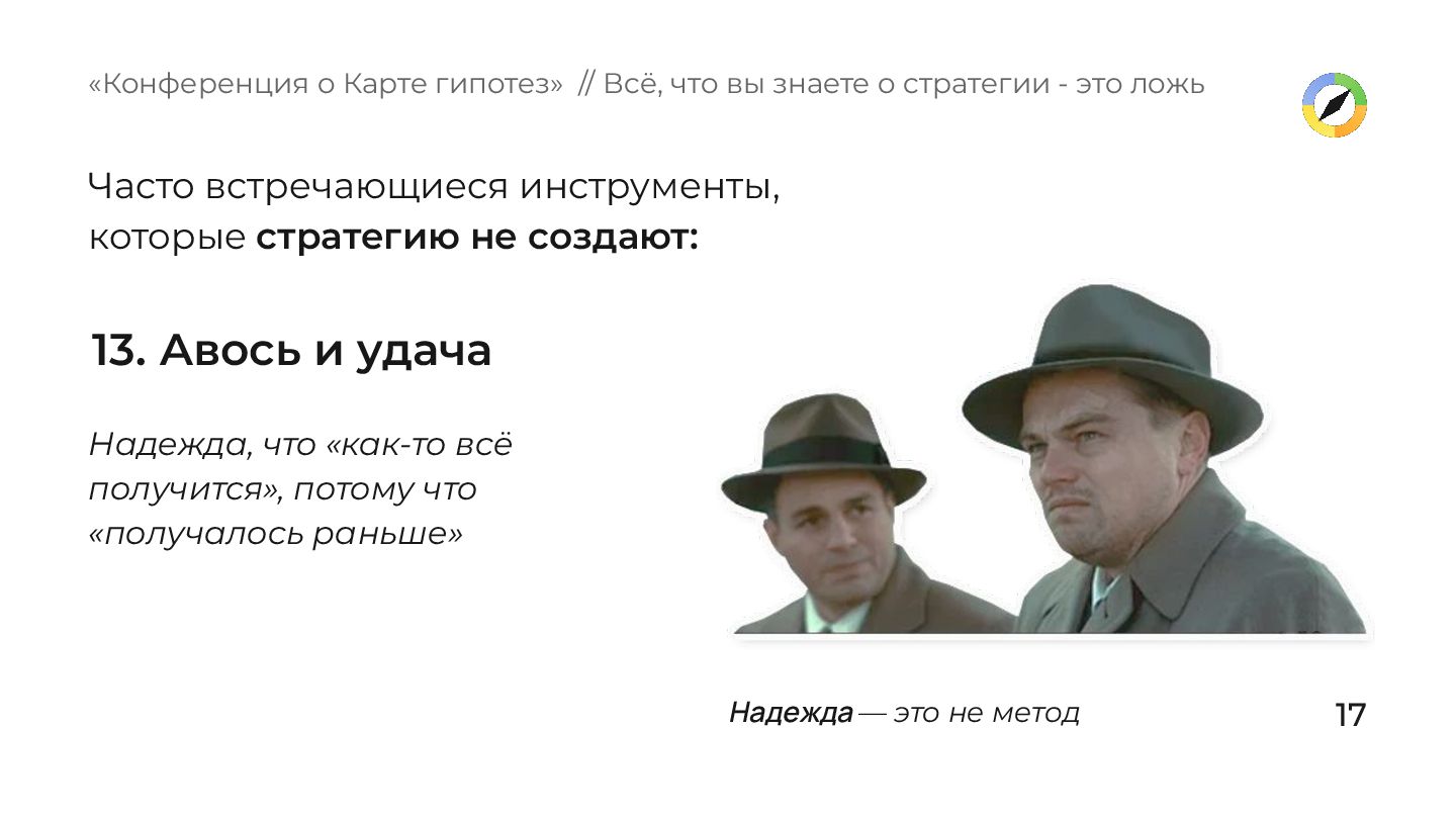 потому что «получалось раньше» «Конференция о Карте гипотез» // Всё, что вы знаете о стратегии - это ложь Надежда — это не метод Часто встречающиеся инструменты, которые стратегию не создают: