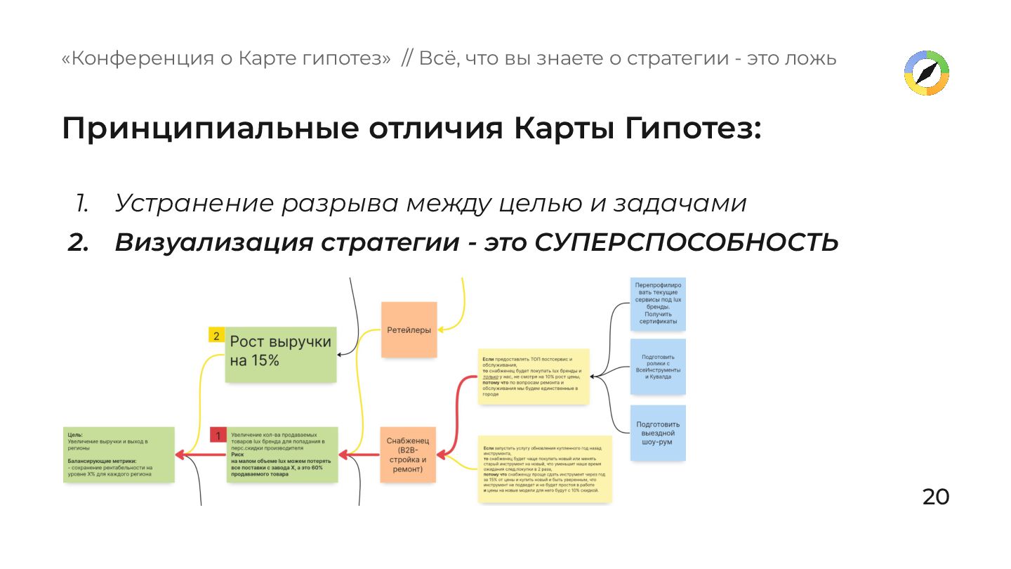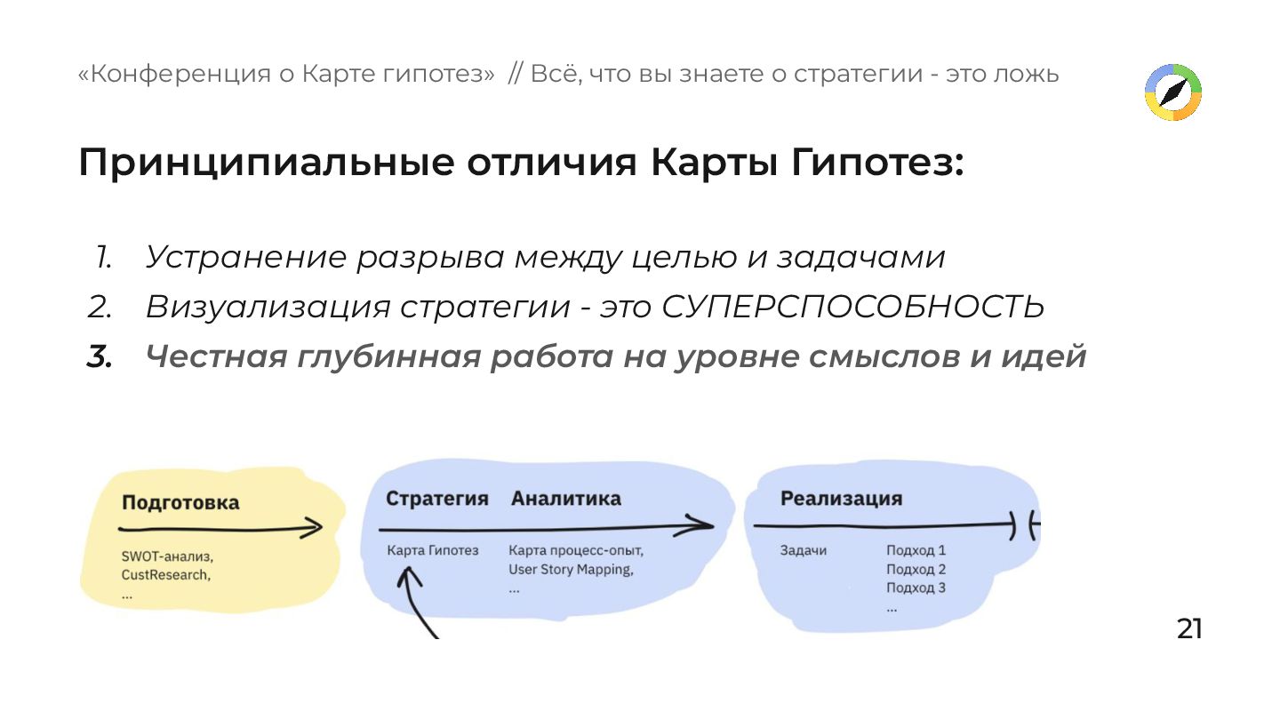 - это СУПЕРСПОСОБНОСТЬ 3. Честная глубинная работа на уровне смыслов и идей 21 «Конференция о Карте гипотез» // Всё, что вы знаете о стратегии - это ложь Принципиальные отличия Карты Гипотез: