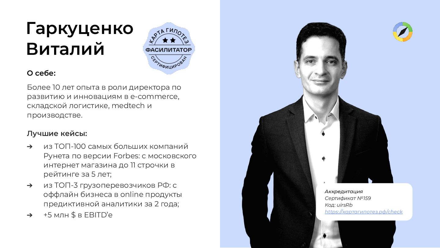 развитию и инновациям в e-commerce, складской логистике, medtech и производстве. Лучшие кейсы: ➔ из ТОП-100 самых больших компаний Рунета по версии Forbes: с московского интернет магазина до 11 строчки в рейтинге за 5 лет; ➔ из ТОП-3 грузоперевозчиков РФ: с оффлайн бизнеса в online продукты предиктивной аналитики за 2 года; ➔ +5 млн $ в EBITD’е https://garkucenko.ru/ О себе: 3 Аккредитация Сертификат №159 Код: uirsRb https://картагипотез.рф/check