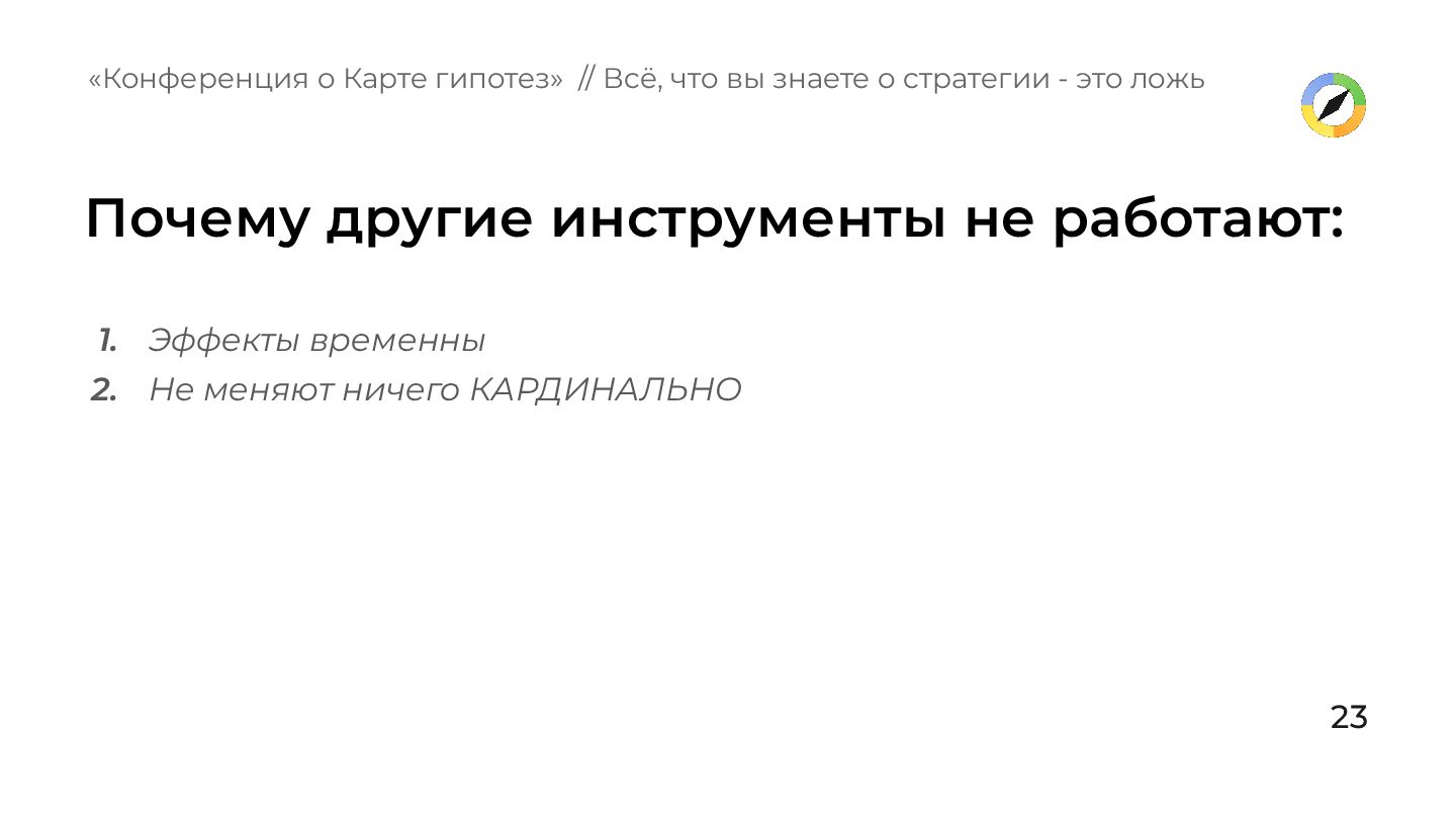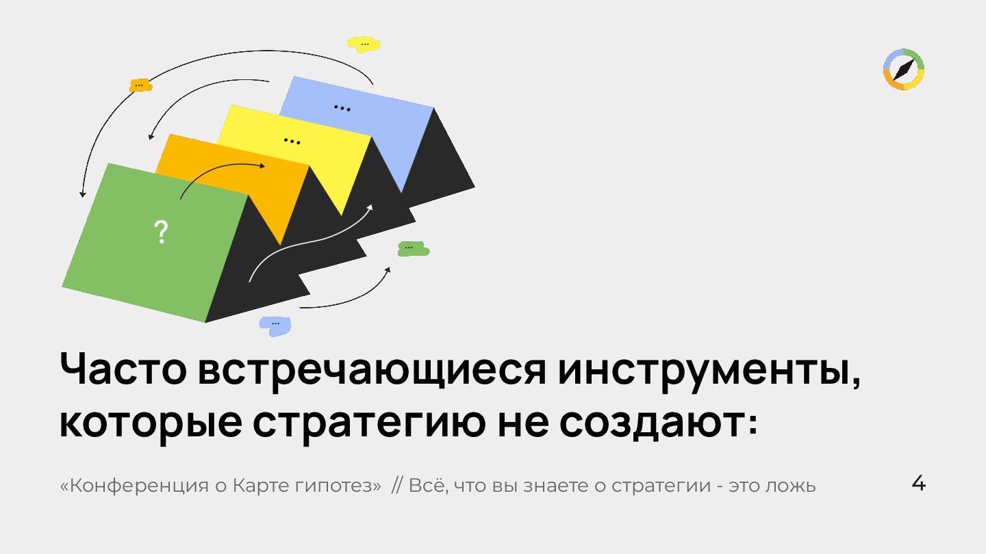 вперед» «Конференция о Карте гипотез» // Всё, что вы знаете о стратегии - это ложь Они описывают «что делать», но не отвечают на «почему именно это сработает». Часто встречающиеся инструменты, которые стратегию не создают: