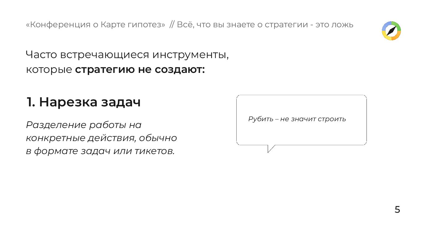 в формате задач или тикетов. Рубить – не значит строить «Конференция о Карте гипотез» // Всё, что вы знаете о стратегии - это ложь Часто встречающиеся инструменты, которые стратегию не создают: