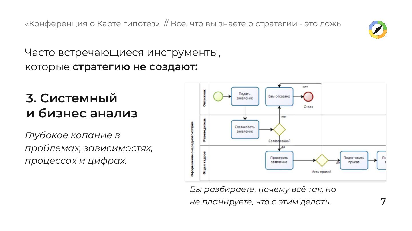 зависимостях, процессах и цифрах. «Конференция о Карте гипотез» // Всё, что вы знаете о стратегии - это ложь Вы разбираете, почему всё так, но не планируете, что с этим делать. Часто встречающиеся инструменты, которые стратегию не создают: