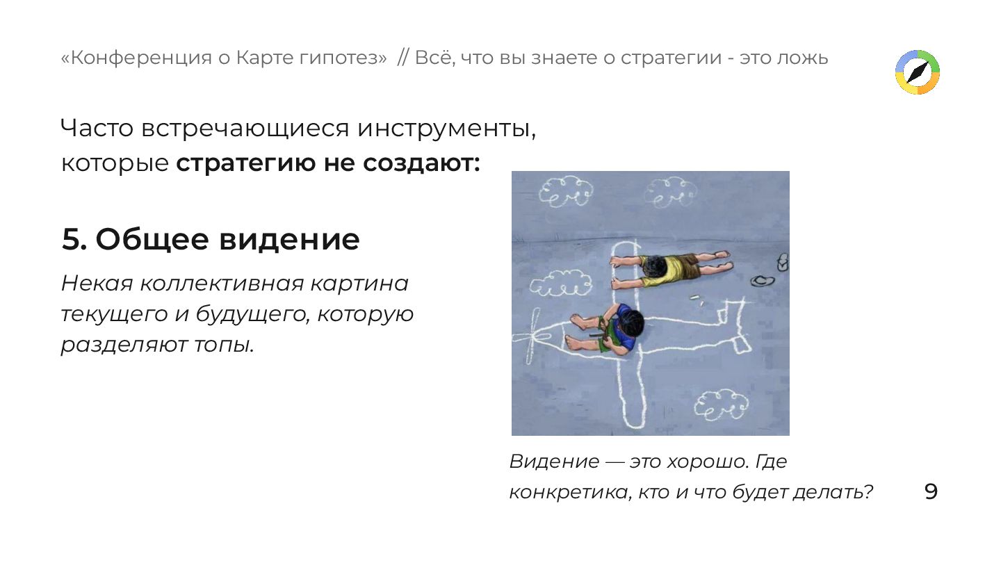 которую разделяют топы. «Конференция о Карте гипотез» // Всё, что вы знаете о стратегии - это ложь Видение — это хорошо. Где конкретика, кто и что будет делать? Часто встречающиеся инструменты, которые стратегию не создают: