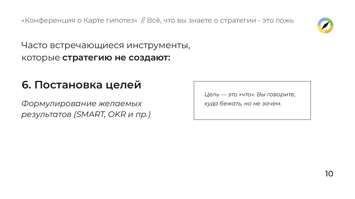 пр.) Часто встречающиеся инструменты, которые стратегию не создают: Цель — это «что». Вы говорите, куда бежать, но не зачем. «Конференция о Карте гипотез» // Всё, что вы знаете о стратегии - это ложь