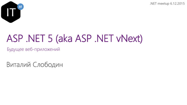 Доклад о будущем .NET. Open source all things. Описание ASP.NET 5. Breaking changes. Кроссплатформенная разработка. Новые инструменты. Поддержка “облаков”. Новые способы хостинга приложений.