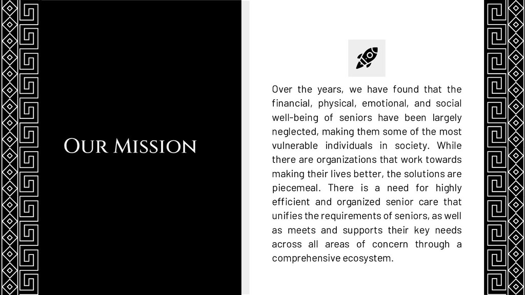 financial, physical, emotional, and social well-being of seniors have been largely neglected, making them some of the most vulnerable individuals in society. While there are organizations that work towards making their lives better, the solutions are piecemeal. There is a need for highly efficient and organized senior care that unifies the requirements of seniors, as well as meets and supports their key needs across all areas of concern through a comprehensive ecosystem.
