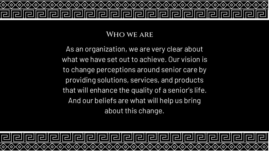 about what we have set out to achieve. Our vision is to change perceptions around senior care by providing solutions, services, and products that will enhance the quality of a senior’s life. And our beliefs are what will help us bring about this change.