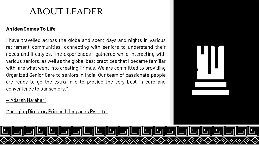 across the globe and spent days and nights in various retirement communities, connecting with seniors to understand their needs and lifestyles. The experiences I gathered while interacting with various seniors, as well as the global best practices that I became familiar with, are what went into creating Primus. We are committed to providing Organized Senior Care to seniors in India. Our team of passionate people are ready to go the extra mile to provide the very best in care and convenience to our seniors.” — Adarsh Narahari Managing Director, Primus Lifespaces Pvt. Ltd.
