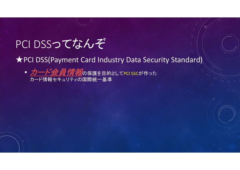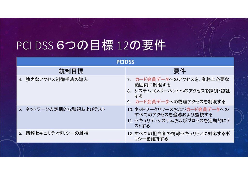 カード会員データを保護するために、ファイア ウォールをインストール して構成を維持する 2. システムパスワードおよびその他のセキュリティパ ラメータにベンダ提供のデフォルト値を使用しない 2. カード会員データの保護 3. 保存されるカード会員データを保護する 4. オープンな公共ネットワーク経由でカード会員デー タを伝送する場合、 暗号化する 3. 脆弱性管理プログラムの維持 5. すべてのシステムをマルウェアから保護し、ウイル ス対策ソフトウェア またはプログラムを定期的に更 新する 6. 安全性の高いシステムとアプリケーションを開発し、 保守する