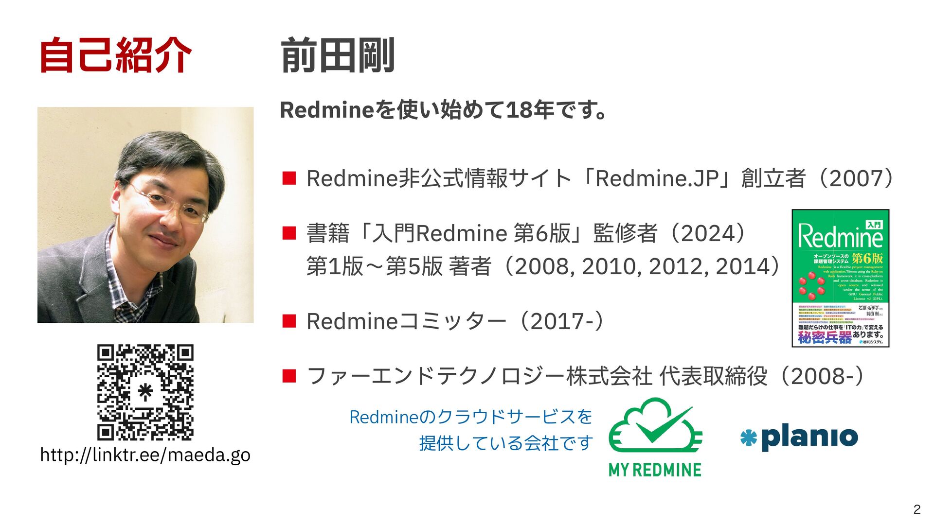 第6版」監修者(2024) 第1版〜第5版 著者(2008, 2010, 2012, 2014) ▪ Redmineコミッター(2017-) ▪ ファーエンドテクノロジー株式会社 代表取締役(2008-) http://linktr.ee/maeda.go 自己 紹介 前 田 剛 Redmineのクラウドサービスを 提供している会社です Redmineを使い始めて18年です。