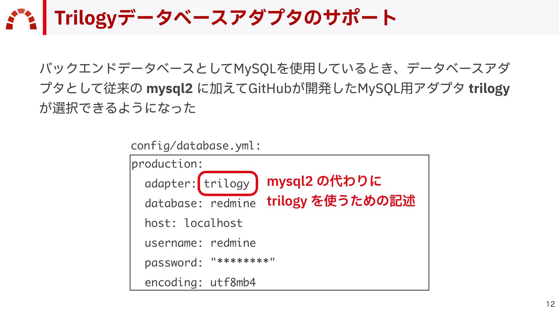 trilogy が選択できるようになった production: adapter: trilogy database: redmine host: localhost username: redmine password: "********" encoding: utf8mb4 config/database.yml: mysql2 の代わりに trilogy を使うための記述