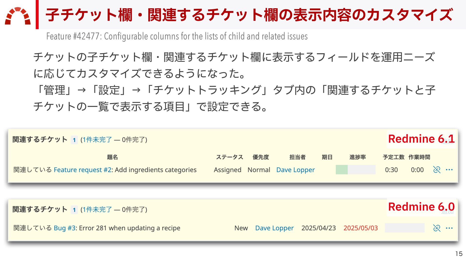 columns for the lists of child and related issues チケットの 子 チケット欄・関連するチケット欄に表 示 するフィールドを運 用 ニーズ に応じてカスタマイズできるようになった。 「管理」→「設定」→「チケットトラッキング」タブ内の「関連するチケットと 子 チケットの 一 覧で表 示 する項 目 」で設定できる。 Redmine 6.1 Redmine 6.0