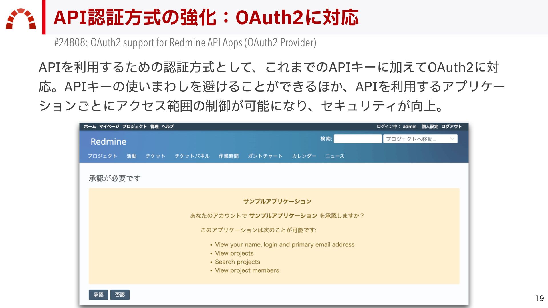 用 するアプリケー ションごとにアクセス範囲の制御が可能になり、セキュリティが向上。 #24808: OAuth2 support for Redmine API Apps (OAuth2 Provider)