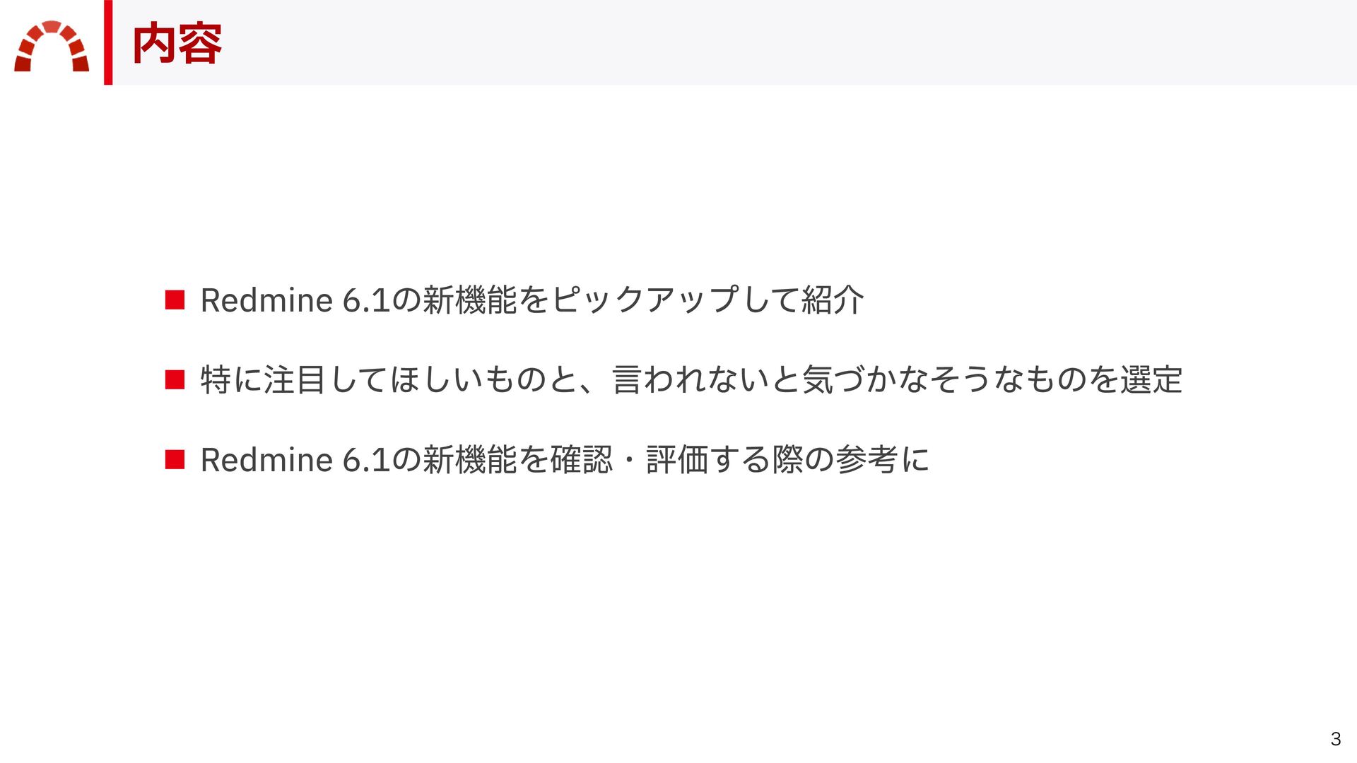内容 ▪ Redmine 6.1の新機能をピックアップして紹介 ▪ 特に注 目 してほしいものと、 言