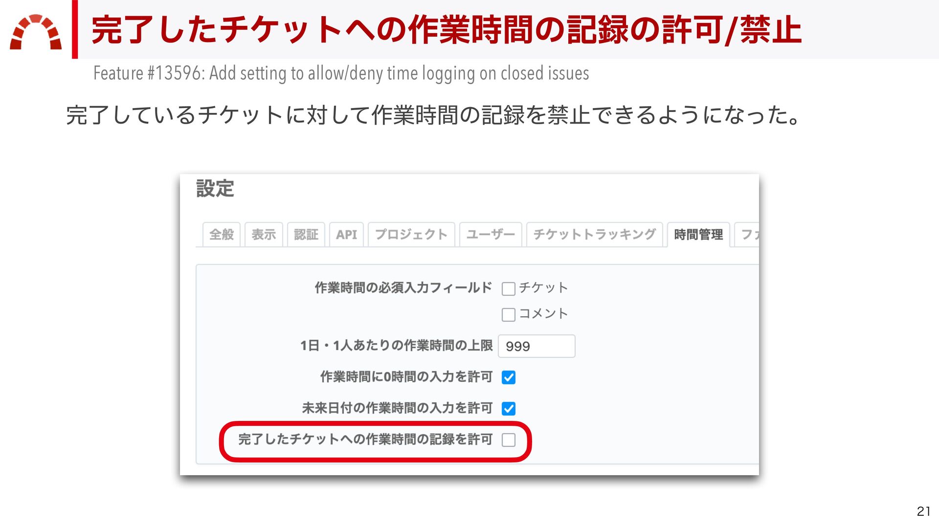 logging on closed issues 完了しているチケットに対して作業時間の記録を禁 止 できるようになった。