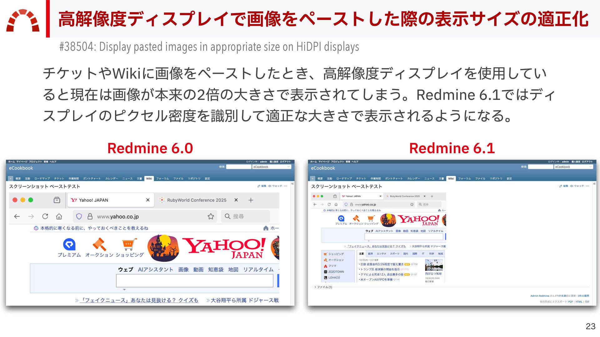 appropriate size on HiDPI displays チケットやWikiに画像をペーストしたとき、 高 解像度ディスプレイを使 用 してい ると現在は画像が本来の2倍の 大 きさで表 示 されてしまう。Redmine 6.1ではディ スプレイのピクセル密度を識別して適正な 大 きさで表 示 されるようになる。 Redmine 6.1 Redmine 6.0