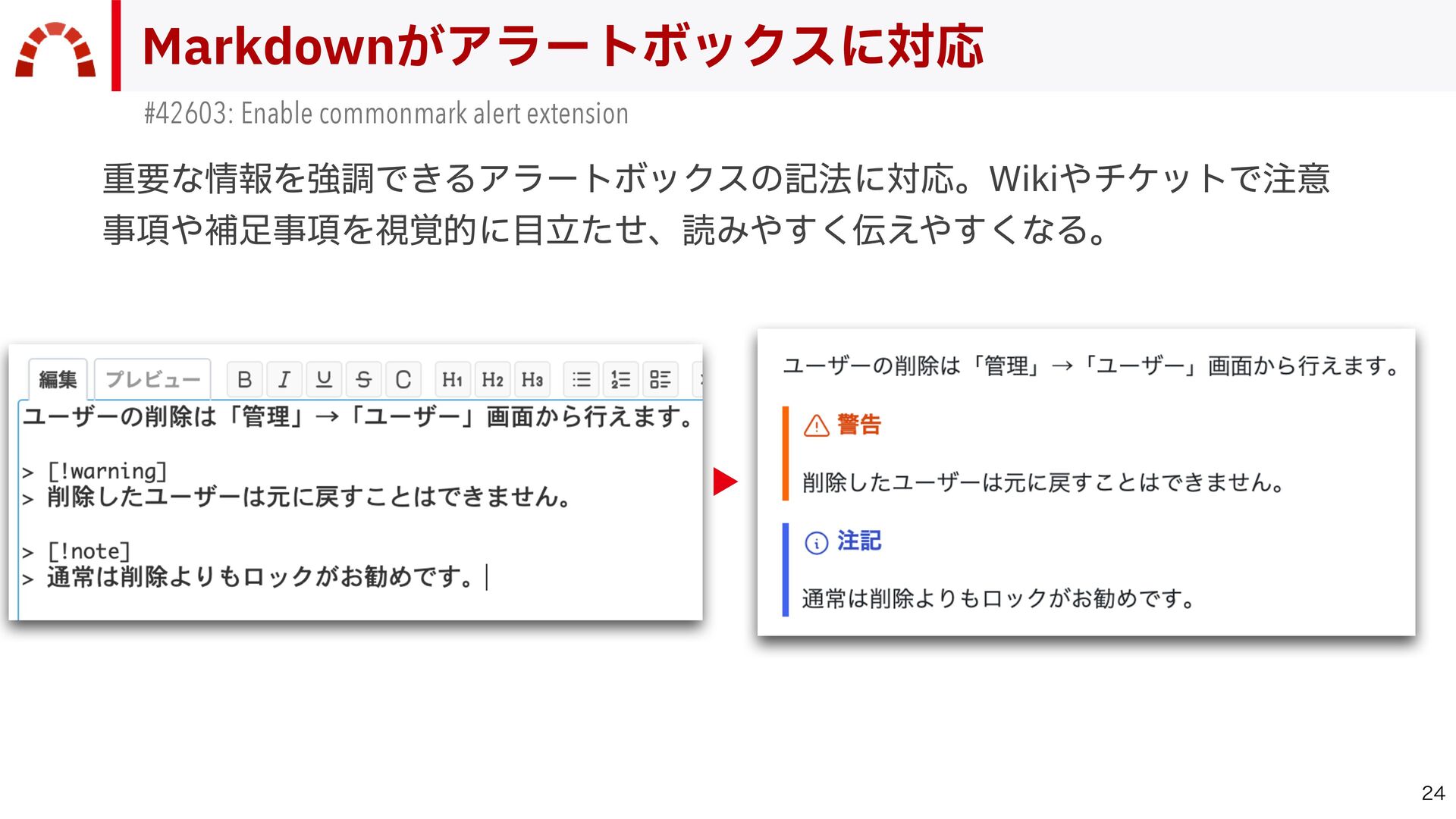 Markdownがアラートボックスに対応 #42603: Enable commonmark alert extension 重要な情報を強調できるアラートボックスの記法に対応。Wikiやチケットで注意 事項や補 足