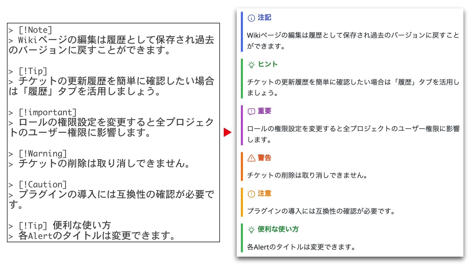 > [!important] > ロールの権限設定を変更すると全プロジェク トのユーザー権限に影響します。 > [!Warning] > チケットの削除は取り消しできません。 > [!Caution] > プラグインの導入には互換性の確認が必要で す。 > [!Tip] 便利な使い方 > 各Alertのタイトルは変更できます。 ▶