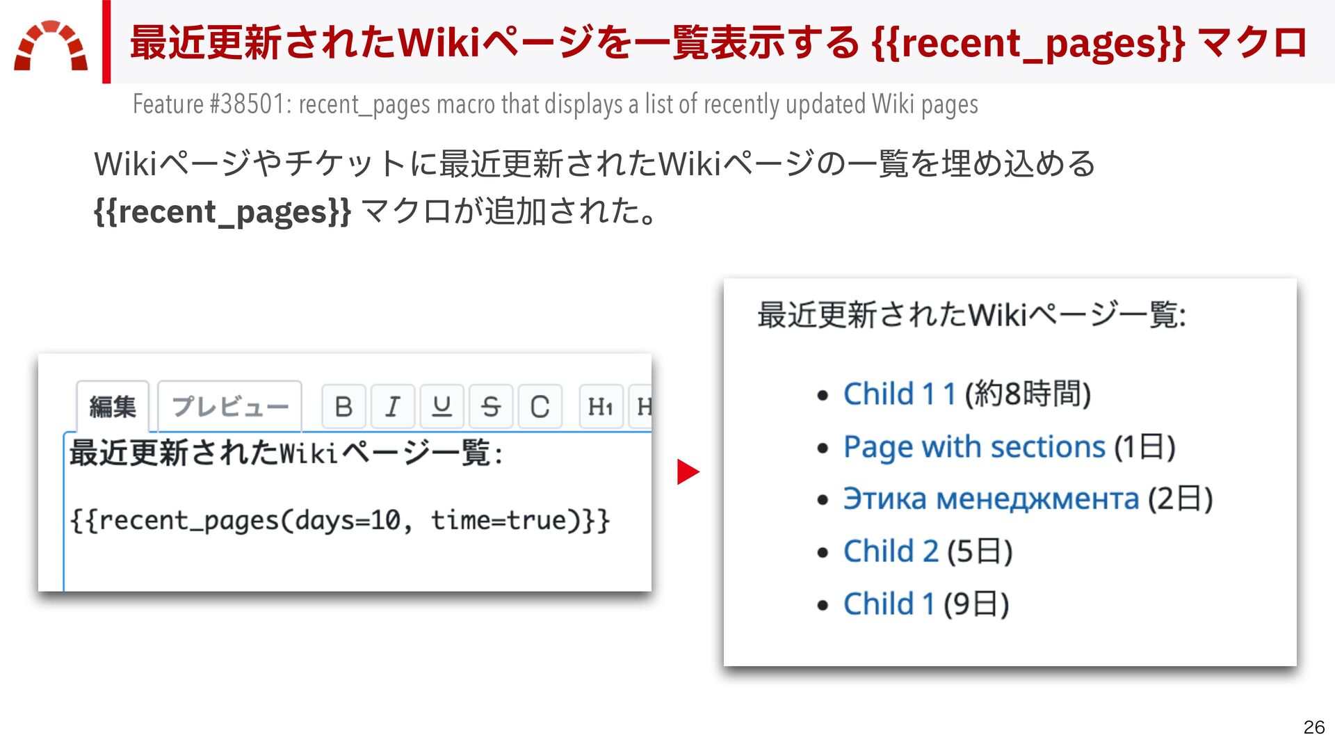 最近更新されたWikiページを 一 覧表 示 する {{recent_pages}} マクロ Feature #38501: