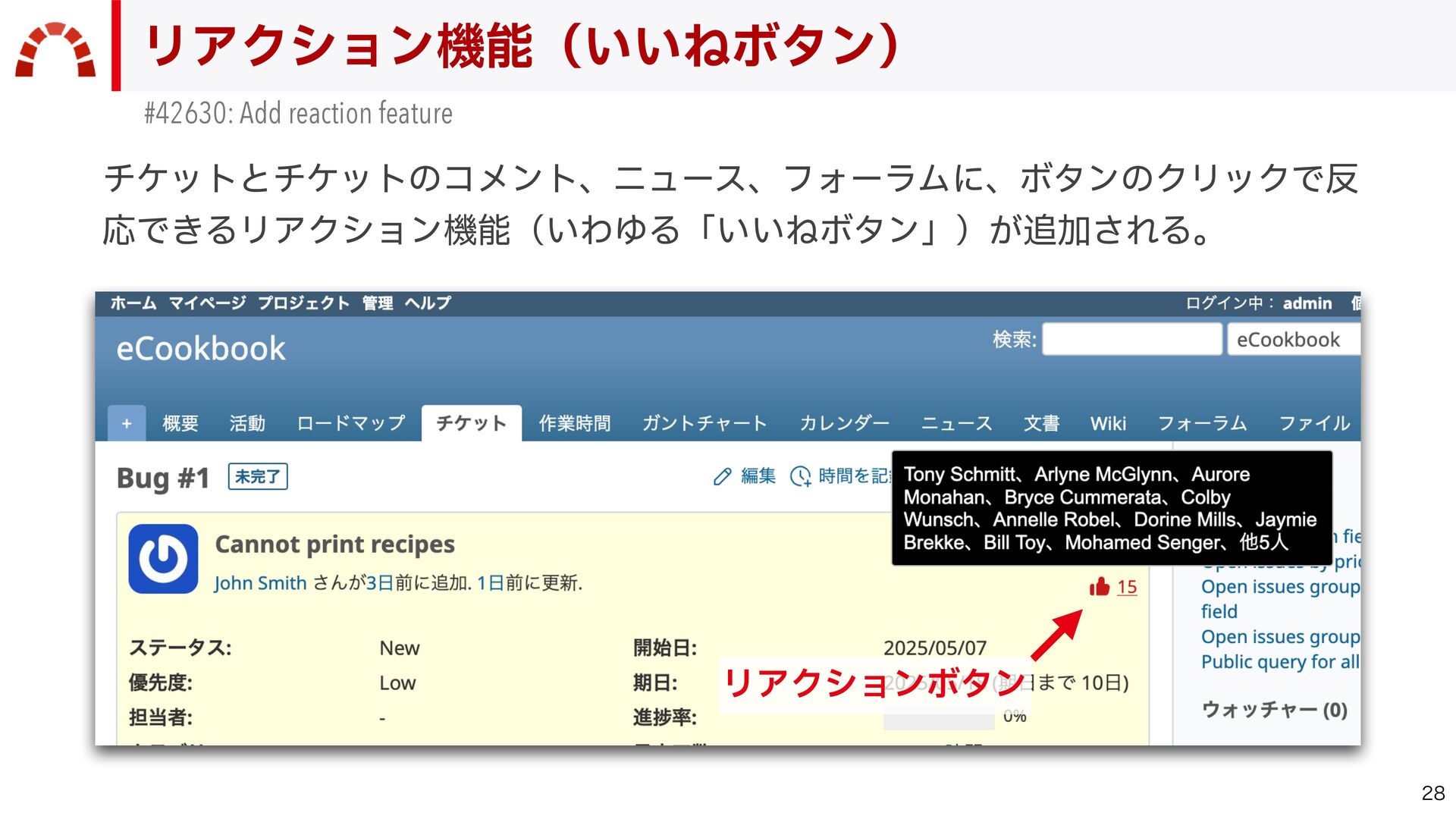 リアクション機能(いいねボタン) #42630: Add reaction feature チケットとチケットのコメント、ニュース、フォーラムに、ボタンのクリックで反 応できるリアクション機能(いわゆる「いいねボタン」)が追加される。 リアクションボタン