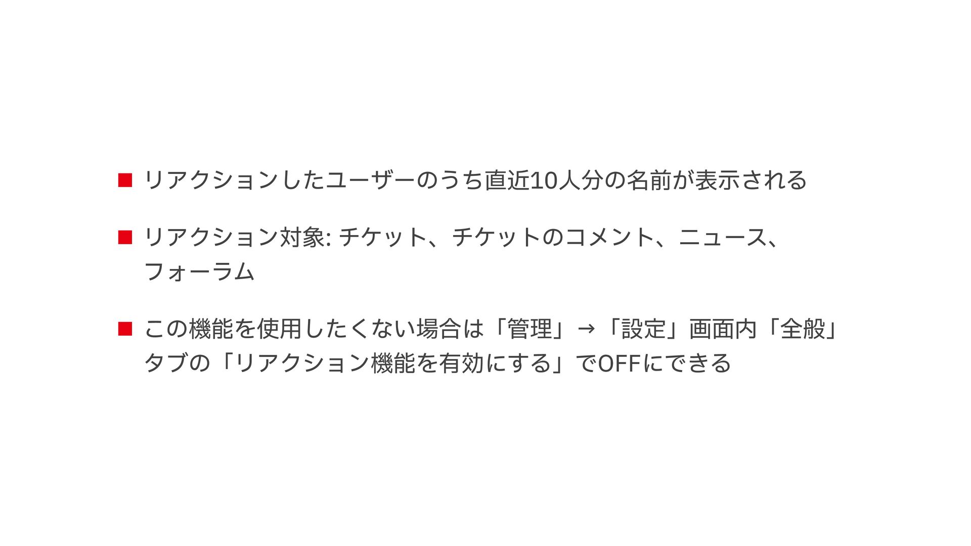 ▪ リアクションしたユーザーのうち直近10 人 分の名前が表 示 される ▪ リアクション対象: チケット、チケットのコメント、ニュース、 フォーラム