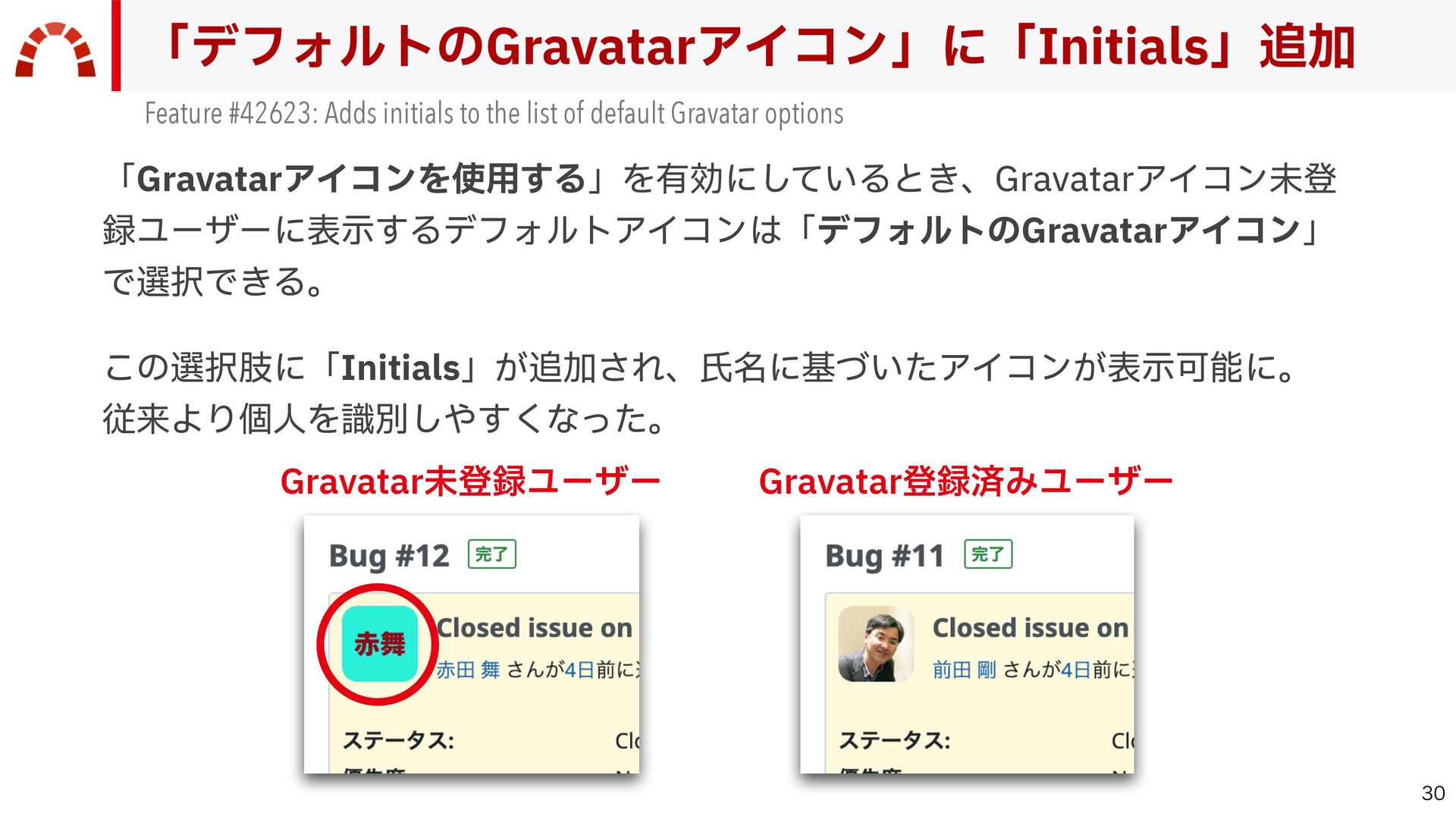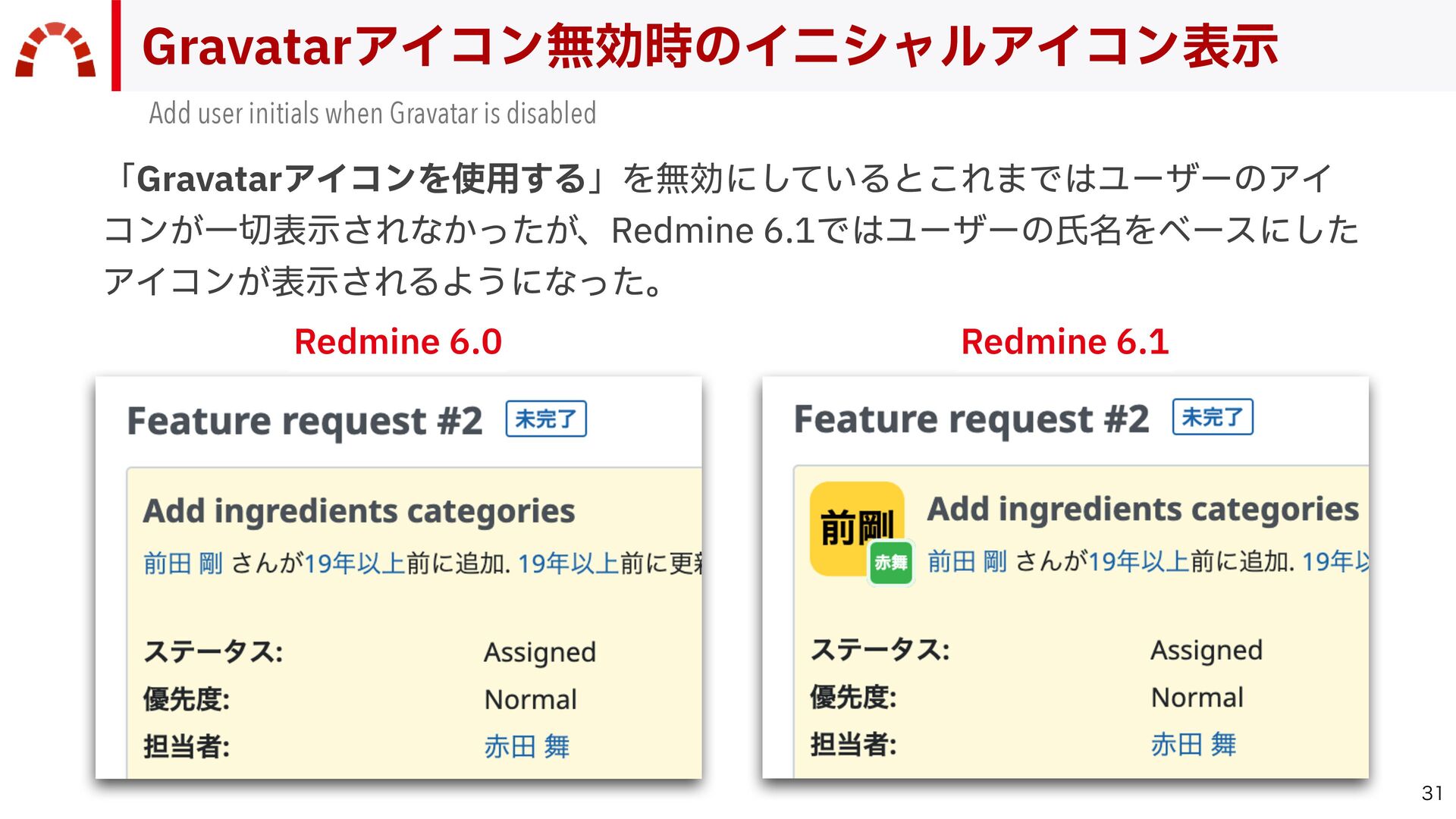 「Gravatarアイコンを使 用 する」を無効にしているとこれまではユーザーのアイ コンが 一 切表 示 されなかったが、Redmine 6.1ではユーザーの 氏 名をベースにした アイコンが表 示 されるようになった。 Redmine 6.0 Redmine 6.1